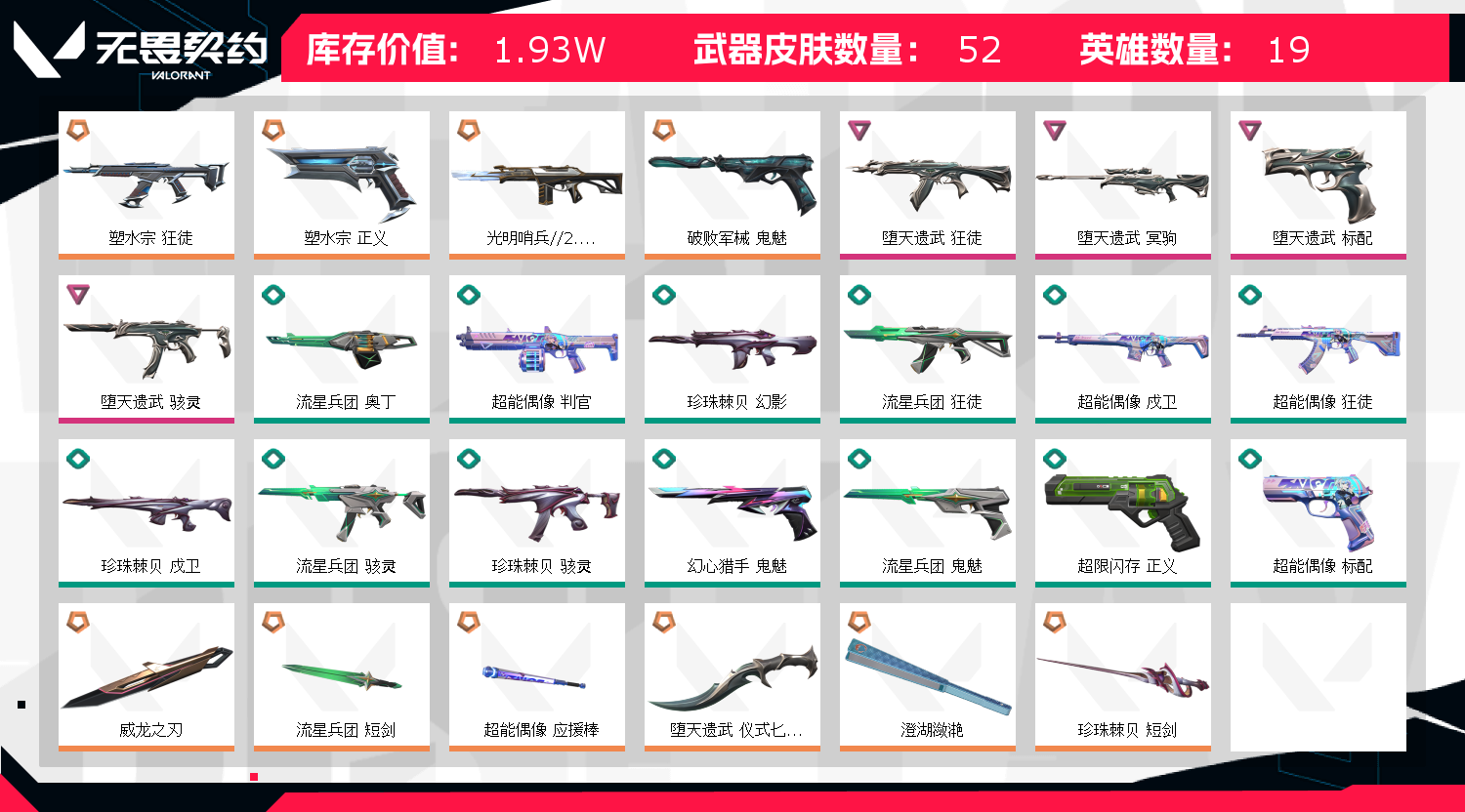 允许 英雄15 武器皮肤数量51 许禁止用R点;威龙之刃,堕天遗武 狂徒,塑水宗 狂徒,堕天遗武 冥驹,塑水宗 正义,堕天遗武 标配,