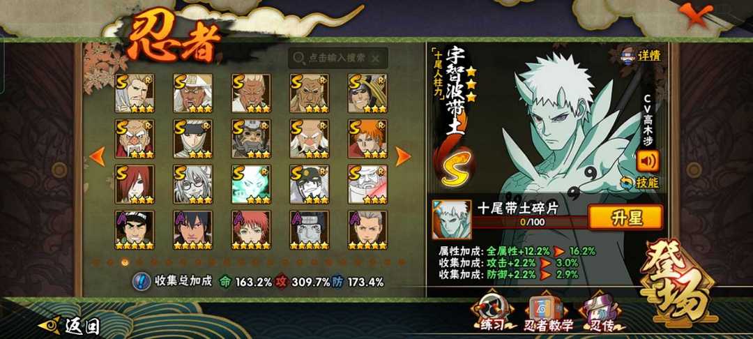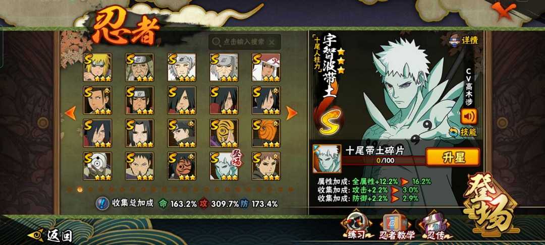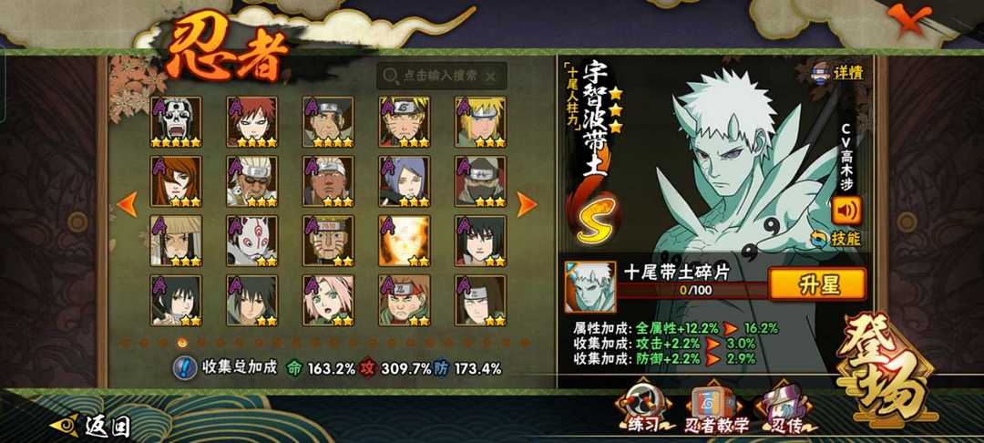 忍者:345个忍者(S九喇嘛连结漩涡鸣人、死门凯、木叶创立斑、忍战带土、青水、秽土柱间、天道超、秽土鼬、红夜之刃神秘面具男)组织:1组