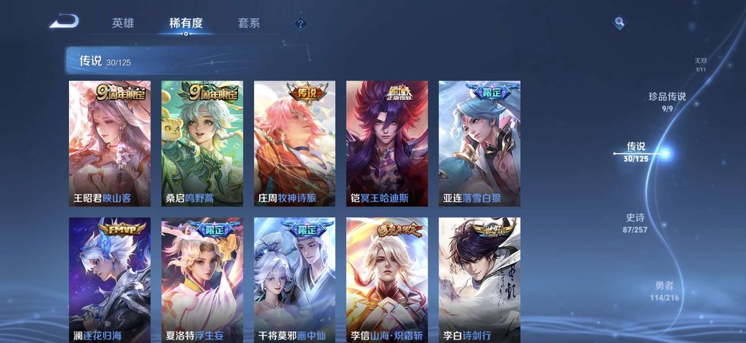 v10、509皮、刘备星传说时之思念、韩信荣耀典藏、瑶珍品传说大耳狗之梦、青丘·九尾、星域神启、画中仙、深海之息、天魔缭乱