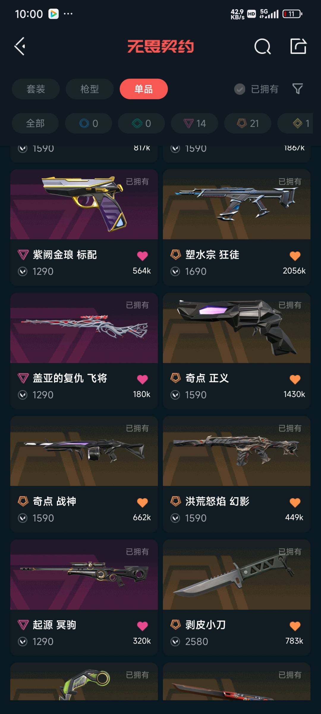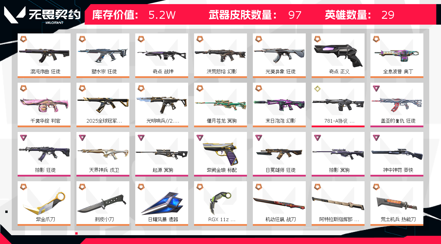 允许 英雄27 武器皮肤数量94;奇点 战神,紫金爪刀,剥皮小刀,盖亚的复仇 狂徒,掠影 狂徒,洪荒怒焰 幻影,天界神兵 戍卫,