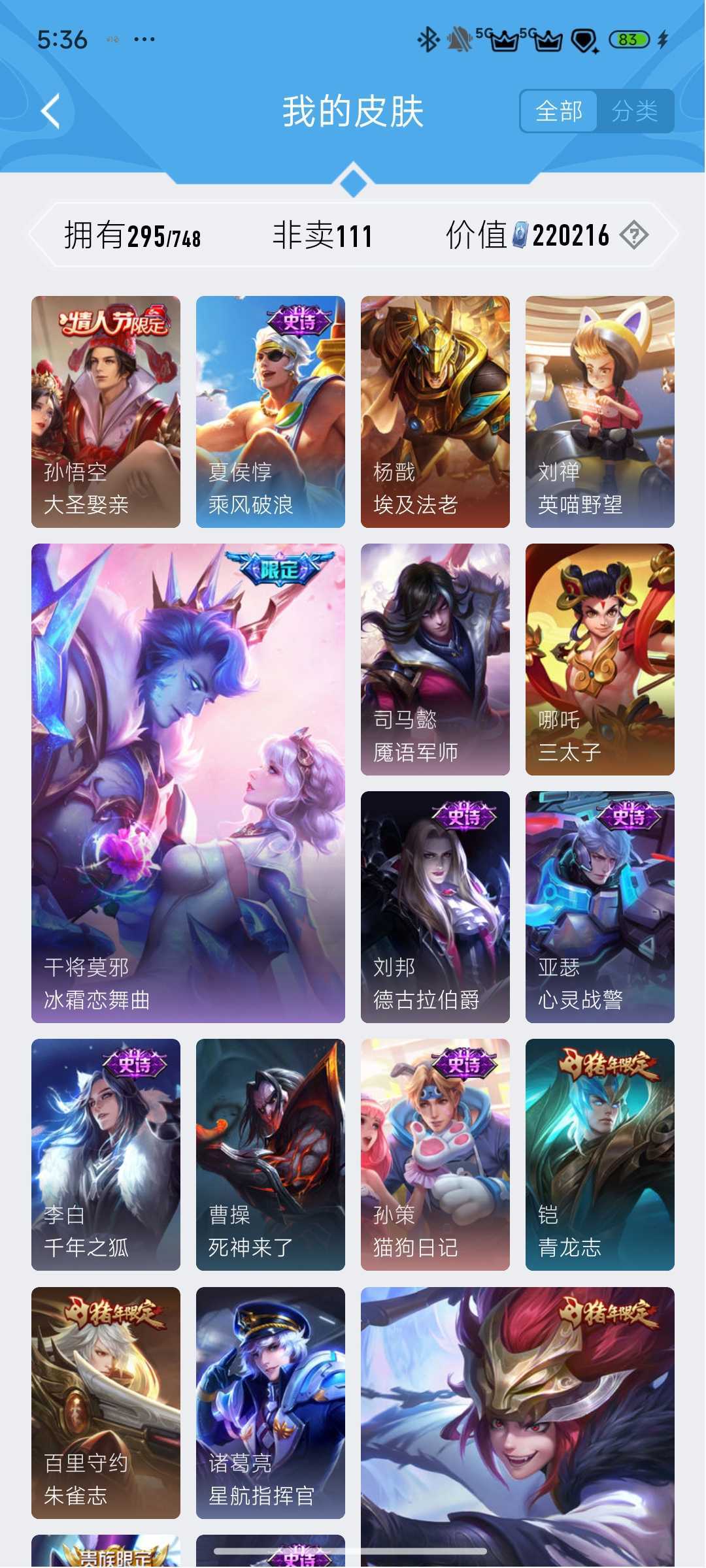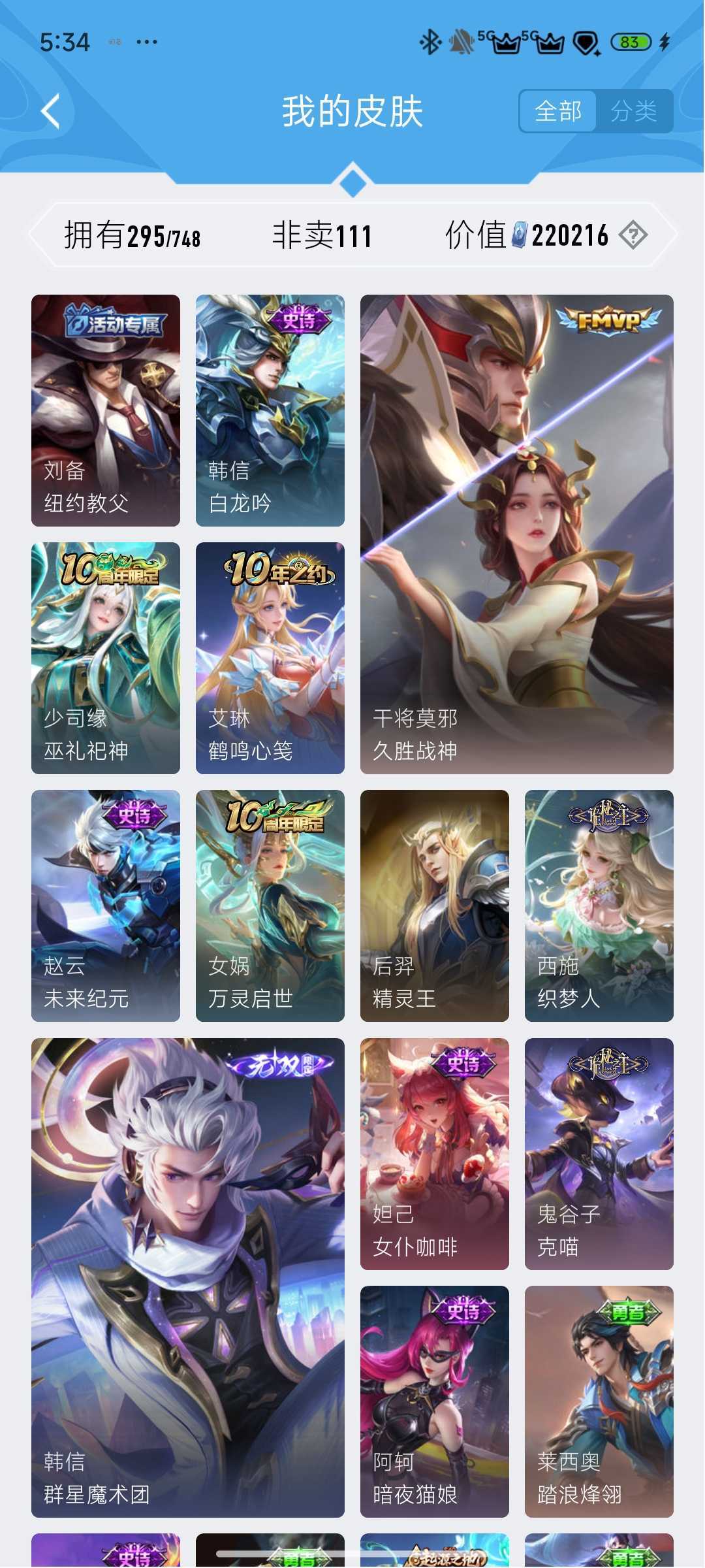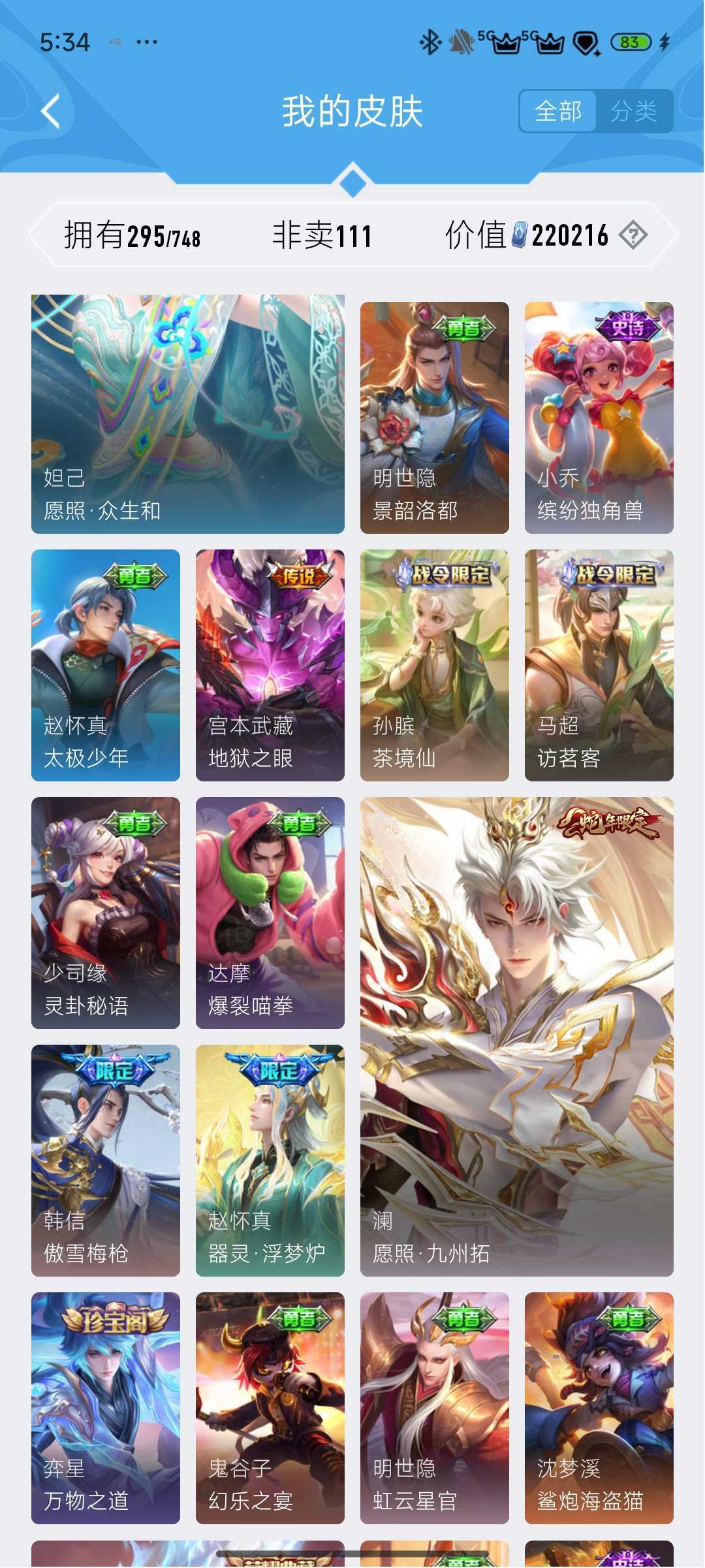 有韩信的荣耀典藏和无双皮肤,还有一些传说皮,质量不错