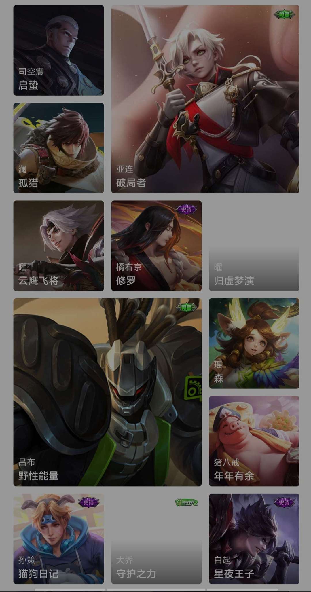 v10、12水539皮、死亡执政官、刘备星传说时之思念、小兵皮肤大耳狗甜茶、瑶无双真我赫兹、愿照·九州拓、怪盗基德、画中仙、至尊宝、凤求凰、神威、天魔缭乱