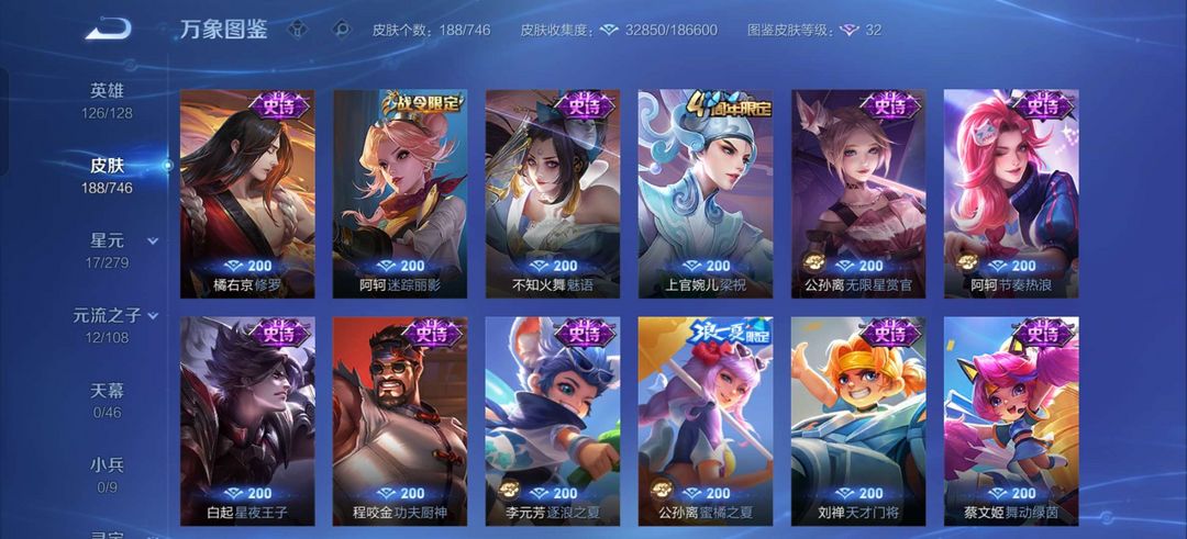 VIP 10!460皮肤!16个荣耀水晶!五星元皮肤!三无双!!。 165限定。极品账号低价,欢迎下单。韩信荣耀典藏武则天神域,铠荣耀典藏。