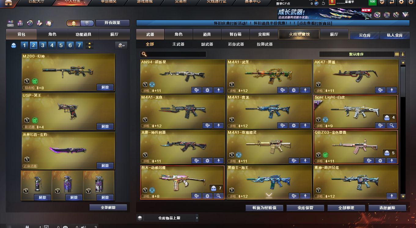 【传说暗裔】【M200 - 幻神】【USP - 冥王】【Scar Light - 白虎 + Scar Light - 白虎 - 暗星】【QBZ03 - 金色蔷薇】【2 烈龙 + 烈龙 - 星空 + 烈龙 - 云海游龙】【1 炼狱】【M4A1 - 雷神 (2)+ 雷神 - 葫芦兄弟 + 雷神 - 源计划 2.0 专属皮肤 + 雷神 - 虎将 + 雷神 - 能量核心 + 雷神 - 星空】【AK47 - 火麒麟 + 火麒麟 - CFSTAR + 火麒麟 - 华夏之心】【Barrett - 毁灭 (3)+ 毁灭 - 星空 + 毁灭耀金皮肤 + 毁灭 - 暗月 + Barrett - 毁灭音效卡】【M4A1 - 黑骑士 (3)+ 黑骑士 - 海王 + 黑骑士 - 暗月】【葵 / 樱 / 荆棘 / 王者 - 救世主 / 王者 - 魅影 / 王者 - 瞳 - 闭月羞花 / 王者零 - 华冠丽服 / 王者凌霄 / 代号:翼 / 铁扇公主 / 虚空 / 乔伊教练 / 幽 / 云海玲珑 / 兰 - 梨园特工】【Barrett - 极光 /barrett - 金色蔷薇 / 王者凰鸣 - 觉醒版 / 王者之怒 - 觉醒版 (2)/AWM - 天龙 (2)/M4A1 - 青龙 / M4A1 - 黑龙 (2)/M4A1 - 龙血 / M4A1 - 武圣 / M4A1 - 玫瑰精灵 / AK12 - 天启 / AK47 - 无影 (2)/ 无影 - 神兵利器 / AK47 - 黑鲨 / AN94 - 超新星 / 烈火 - 动感闪耀 / 悦蓝 - 惊涛骇浪 - 觉醒版 / 天神 - 动感闪耀 / 沙鹰 - 天神 (2)/ 沙鹰 - 修罗 / Glock18 - 武圣 / 麒麟刺 / 龙啸 (2)/ 擎天 (3)/ 擎天 - 云海游龙 / 屠龙 - 动感闪耀 / 屠龙 / 幻灵之锋 / 丛林匕首 - 玄豹 / 龙啸 - 烈火龙威】【白虎 - 迷你小艾 (2)/ 雷神 - 小红 / AWM - 灵狐 - 15 周年嘉年华 / 异变清道夫 - 蛇影双骄 / 夺魂 (3)/ 迷你曼提柯尔 / 迷你火种 (3)/ 迷你白狐 / Mini 沃特 X (2)/ 魔能飞环 - 曼陀罗 (2)/ 迷你裂空之翼 (3)/ 迷你波特博士 (3)/ 冰火魔兽】【Barrett - 极光 - 能量核心】【AK47 - 无影 - 暗月 + AK47 - 无影 - 能量核心】【AK47 - 黑武士 - 361】【M4A1 - 千变 - 孔明皮肤】【AK12 - 天启 - 暗月】【沙鹰 - 修罗 - CFSTAR + 沙鹰 - 修罗 - 能量核心】【沙鹰 - 天神 - 暗月】【牛魔王玩偶 - 至尊黄金】;QBZ03-金色蔷薇,M200-幻神,Scar Light-白虎,传说暗裔,