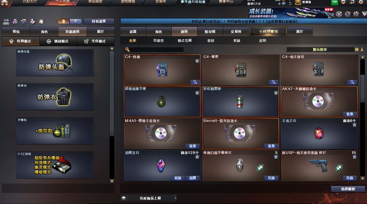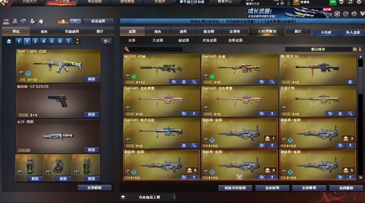 M200-幻神(2)+黄忠皮肤】【AWM-裁决】【Scar Light-白虎】【QBZ03-金色蔷薇(2)】【王者之怒-觉醒版/王者之势-觉醒版/王者之幻-觉醒版/王者之心-觉醒版/王者之击-觉醒版】【USP-雷暴/沙鹰-天神(4)/沙鹰-修罗(3)/Glock18-武圣】【屠龙(5)/龙啸/麒麟刺(2)/擎天(2)/斩神刀-雷暴】【雷暴套装】【6烈龙/6炼狱】【斯泰尔-蝴蝶】【王者炎心/王者之翼/王者之魄/王者之影/王者之光/王者之力】【零·纪元/审判者/零/葵/樱/瞳/魅影/春/雅典娜/王者-零/王者-魅影/王者-瞳-闭月羞花/乔伊教练/空/零-水下丽影/灵狐者-黄金海岸】【M4A1-黑骑士音效卡/AK47-火麒麟音效卡/Barrett-毁灭音效卡】【毁灭-英雄计划皮肤/巴雷特-毁灭-CFPL冠军/毁灭-百城浙江皮肤/毁灭耀金皮肤/毁灭-暗月/毁灭-青帝皮肤/极光-能量核心/天龙-CFSTAR/天龙-秘银/天龙-能量核心/火麒麟-CFSTAR/火麒麟-AG/无影-暗月/无影-能量核心/AK-47-雷神/雷神-荣耀之魄/雷神-暗月/雷神-能量核心/雷神-星空/黑骑士-地狱火/黑龙-暗月/黑龙-能量核心/死神-秘银/天启-暗月/战神-流金岁月皮肤/战神-紫绶金章皮肤/战神-粉色甜心皮肤/修罗-CFSTAR/修罗-能量核心/天神-暗月】【Barrett-毁灭(4)/Barrett-极光/Barrett-朱雀/Barrett-暗月传说/AWM-天龙/M4A1-雷神(3)/M4A1-死神(2)/M4A1-黑龙(4)/M4A1-龙血(3)/M4A1-千变/M4A1-黑骑士/M4A1-武圣/M4A1-猎神/M4A1-玫瑰精灵(2)/HK417-朱雀/AK12-天启/AK47-火麒麟(2)/AK47-无影/无影-神兵利器/AK47-雷暴/AK47-黑鲨(2)/AK-47-猩红传说(14)/AK47-机械迷城(2)/AK47-B-战士/AK47-B-战神(2)/AN94-超新星/9A91-烈火/AA-12-雷霆/沙鹰-幻兽/机械迷城-穹宇】;USP-雷暴,QBZ03-金色蔷薇,M200-幻神,Scar Light-白虎,