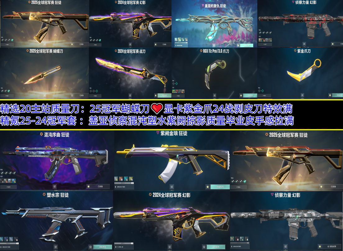 精选20主站质量刀:25冠军蝴蝶刀❤显卡紫金爪️24战剥皮刀特效满 精氪25-24冠军套 :盖亚侦察混沌塑水紫阙掠影质量毕业皮手感拉满;紫金爪刀,剥皮小刀,镭切,归零者 獠犬,盖亚的复仇 狂徒,掠影 戍卫,掠影 狂徒,