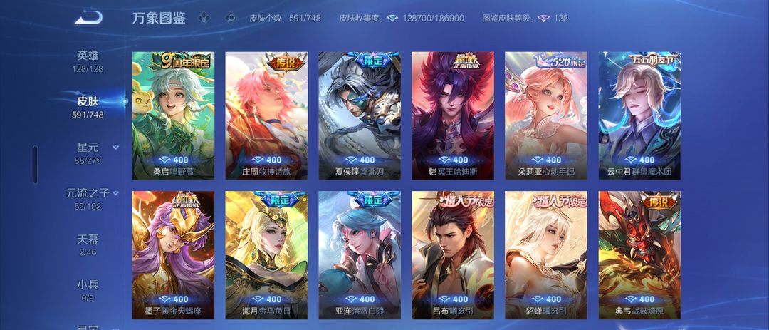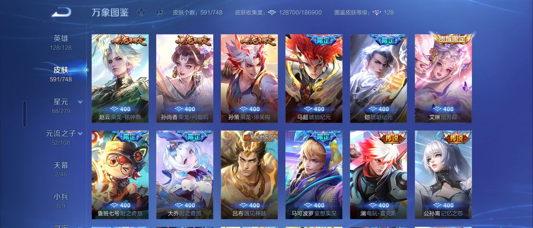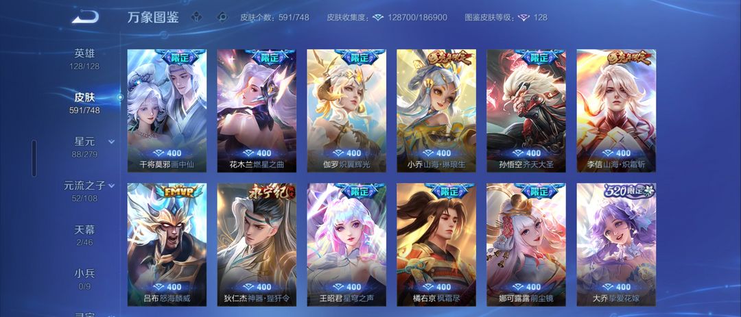 女生号 贵10 多皮肤多传说 别拿那些空号v10来比 要看性价比 貂蝉武则天夏侯惇孙悟空李白鲁班小乔荣耀水晶 妲己九尾无双皮肤 80个传说 473皮肤