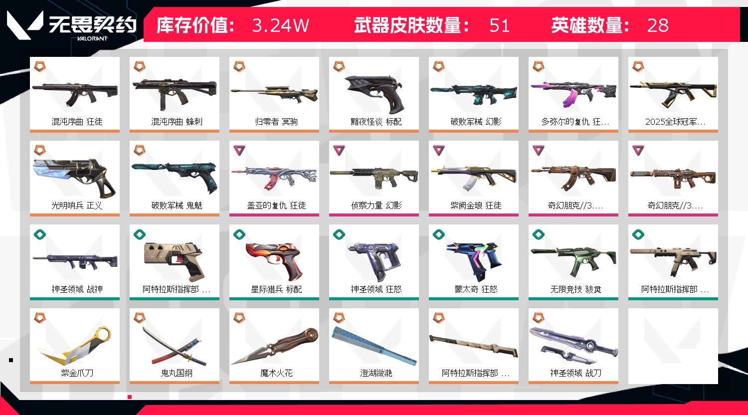 允许 英雄28 武器皮肤数量50;紫金爪刀,盖亚的复仇 狂徒,侦察力量 幻影,紫阙金琅 狂徒,混沌序曲 狂徒,混沌序曲 蜂刺,归零者 冥驹,