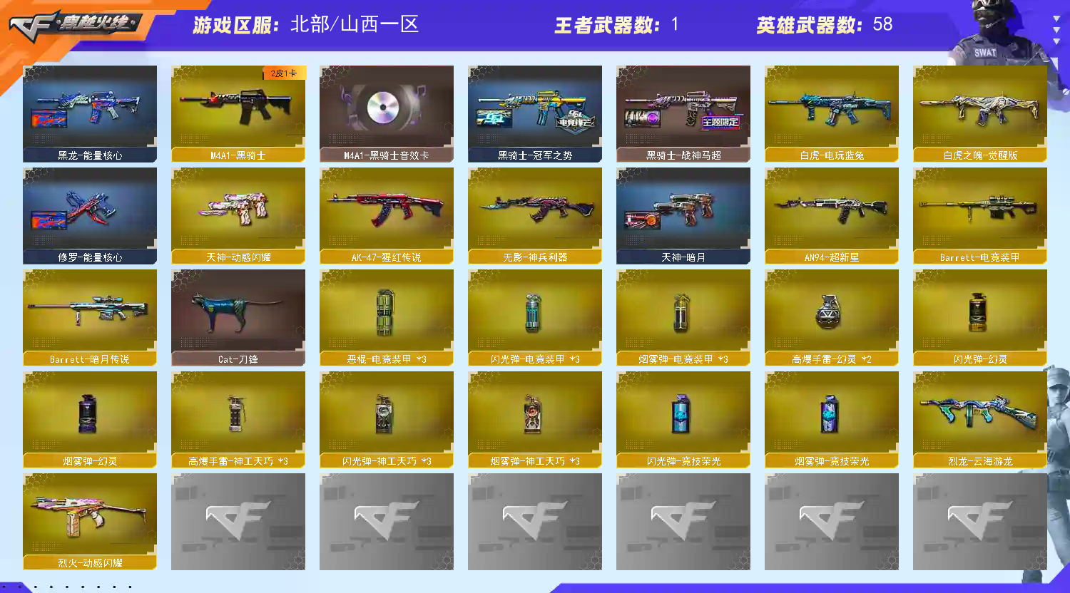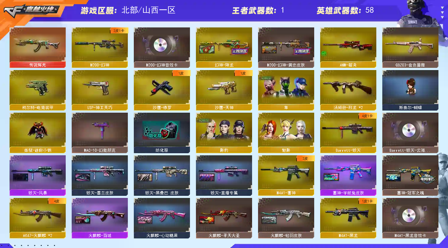 幻神三件套 传说辉光 幻神+降龙+黄忠+音效卡 白虎之魄觉醒版 USP神工天巧 QBZ金色蔷薇 斯泰尔蝴蝶 死亡之眼 2烈龙 黑骑士+冠军之势+音效卡 白虎电玩蓝兔 雷神+冠军之魄 黑龙+音效卡 毁灭+风暴+云海游龙音效卡 烈龙云海游龙 屠龙+云海游龙音效卡 火麒麟+百城+AG战队 USP神工天巧 柯尔特电竞装甲 COP旗袍 炼狱迷你小钢 Cat刀锋 影豹 隼;隼,QBZ03-金色蔷薇,M200-幻神,