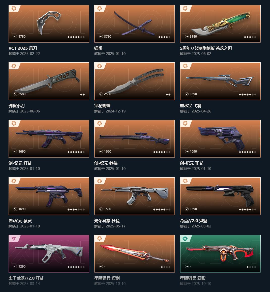 镭切/VCT爪刀/剥皮小刀/苍龙刃/穿花蝴蝶/光荣异象狂徒/塑水宗/离子狂徒/奇点鬼魅/创世纪正义