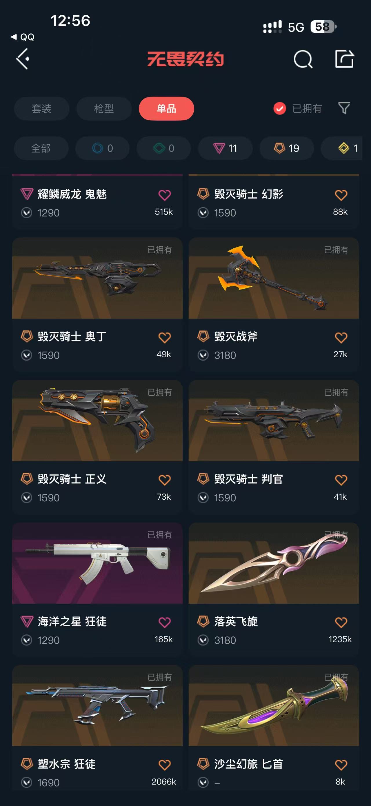 5万库存♥塑水宗狂徒♥盖世英雄狂徒♥紫金标配♥落英飞旋♥毁灭骑士套♥混沌序曲狂徒♥vct爪刀标配
