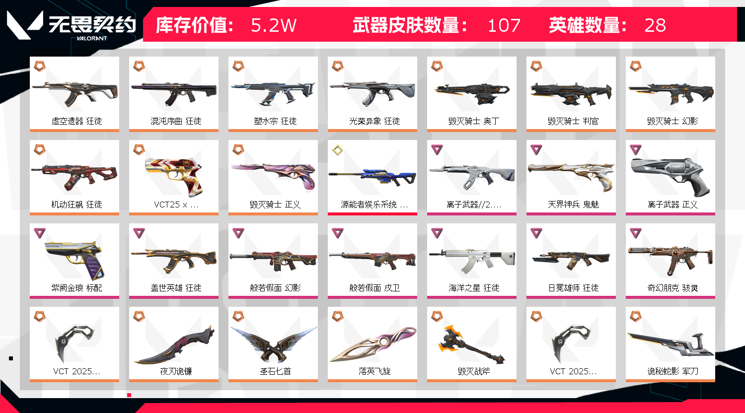 5万库存♥塑水宗狂徒♥盖世英雄狂徒♥紫金标配♥落英飞旋♥毁灭骑士套♥混沌序曲狂徒♥vct爪刀标配;VCT 2025 爪刀,虚空遗器 狂徒,混沌序曲 狂徒,塑水宗 狂徒,光荣异象 狂徒,离子武器//2.0 狂徒,天界神兵 鬼魅,