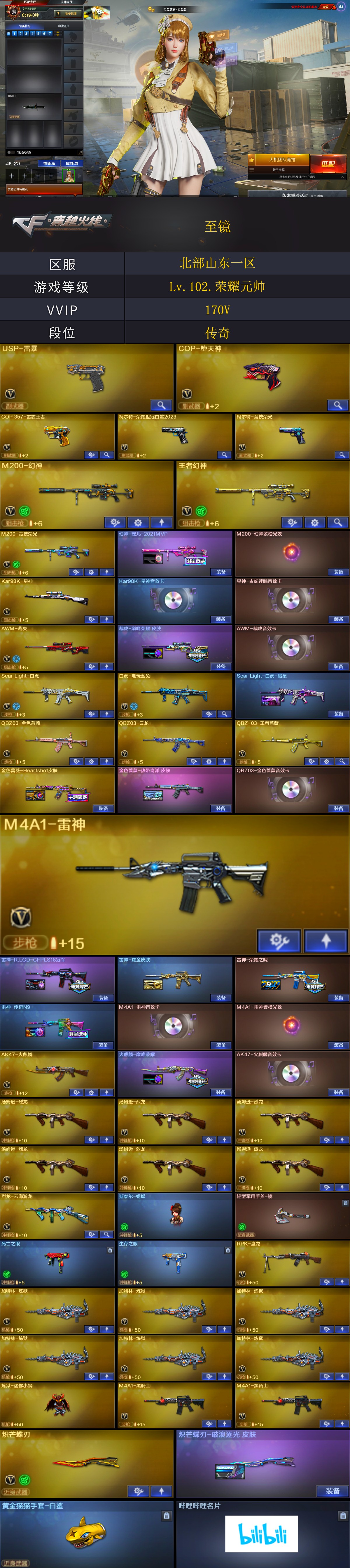 【商品标题】:北部山东一区-170V-可二次实名-【Lv.102.荣耀元帅】-【段位:传奇】 【稀有武器】:M200-幻神/Kar98K-星神/ScarLight-白虎/USP-雷暴/COP-堕天神/柯尔特-竞技荣光/天神-动感闪耀/柯尔特-荣耀世冠白鲨2023/修罗-古蛇迷踪/COP357-雷霆王者-觉醒版/金色蔷薇-古蛇迷踪/QBZ03-云龙/QBZ03-金色蔷薇/AK47-火麒麟/M4A1-黑龙(2)/M4A1-雷神(3)/M4A1-黑骑士(2)/AK47-无影/AK47-黑武士/白虎-电玩蓝兔/Barrett-毁灭(3)/Barrett-极光/AWM-裁决/M200-竞技荣光/RPK-盘龙/加特林-炼狱(6)/汤姆逊-烈龙(6)/AA-12-雷霆/炽芒蝶刃/麒麟刺-堕天神/龙啸-堕天神/马来剑-夜魔/擎天-竞技荣光 【王者武器】:QBZ-03-王者蔷薇-觉醒版/王者之怒-觉醒版/王者幻神-觉醒版/王者之力 【热门角色】:电竞教官-云悠悠/迷迭香/星际战将/隼/奇洋探员/乔伊教练/蛇隐宗/王者炽天使/王者凌霄/炽天使/潘多拉-X/兔囡囡/潘多拉 【热门音效卡】:Kar98K-星神音效卡/AWM-裁决音效卡/QBZ03-金色蔷薇音效卡/M4A1-雷神音效卡/Barrett-毁灭音效卡/M4A1-黑骑士音效卡/AK47-火麒麟音效卡/Barrett-极光音效卡/星神-古蛇迷踪音效卡 【热门皮肤】:幻神-宠儿-2021MVP/裁决-巅峰荣耀皮肤/金色蔷薇-Heartshot皮肤/金色蔷薇-热带奇洋皮肤/屠龙-星火燎原(2)/雷神-R.LGD-CFPLS18冠军/擎天-冠军之击/火麒麟-巅峰荣耀/黑龙-冠军之武/炽芒蝶刃-破浪逐光皮肤/雷神-传奇N9/ScarLight-白虎-暗星/屠龙-荣耀之锋(2)/毁灭-荣耀之怒/龙啸-冠军之啸/雷神-荣耀之魄 【其他亮点】:斯泰尔-蝴蝶/炼狱-迷你小钢/迷你律动酷熊/贝雷塔687-射手座/黄金猫猫手套-白鲨/金刚伞-电玩红兔/烟雾弹-荣耀世冠白鲨2023/哔哩哔哩名片 (截图展示段位不代表实际段位,如赛季更新等不可抗拒因素发生变化,其余道具看截图或咨询客服);USP-雷暴,柯尔特-荣耀世冠白鲨2023,炽芒蝶刃,隼,电竞教官-云悠悠,RPK-盘龙,QBZ03-金色蔷薇,