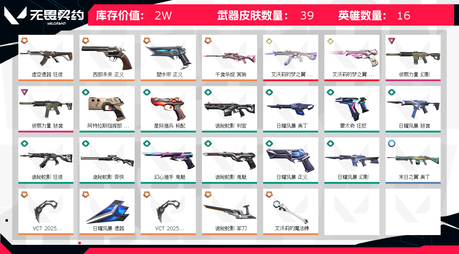 租号老板须知 本公司所有账号已在武汉市公安局申报虚拟财产保护所有开挂开美化包等第三方违规软件 导致账号封禁的将会联合警方平台经理追查 本店铺账号均为数万元起步切勿抱有侥幸心理 据《律法》第二百七五条故意毁坏财产物罪:故意毁坏公私财物,数额较大处罚7年以下有期徒刑已有1例一经发现追查到底望各位自重不要挑战法律;VCT 2025 爪刀,虚空遗器 狂徒,侦察力量 幻影,西部未来 正义,塑水宗 正义,