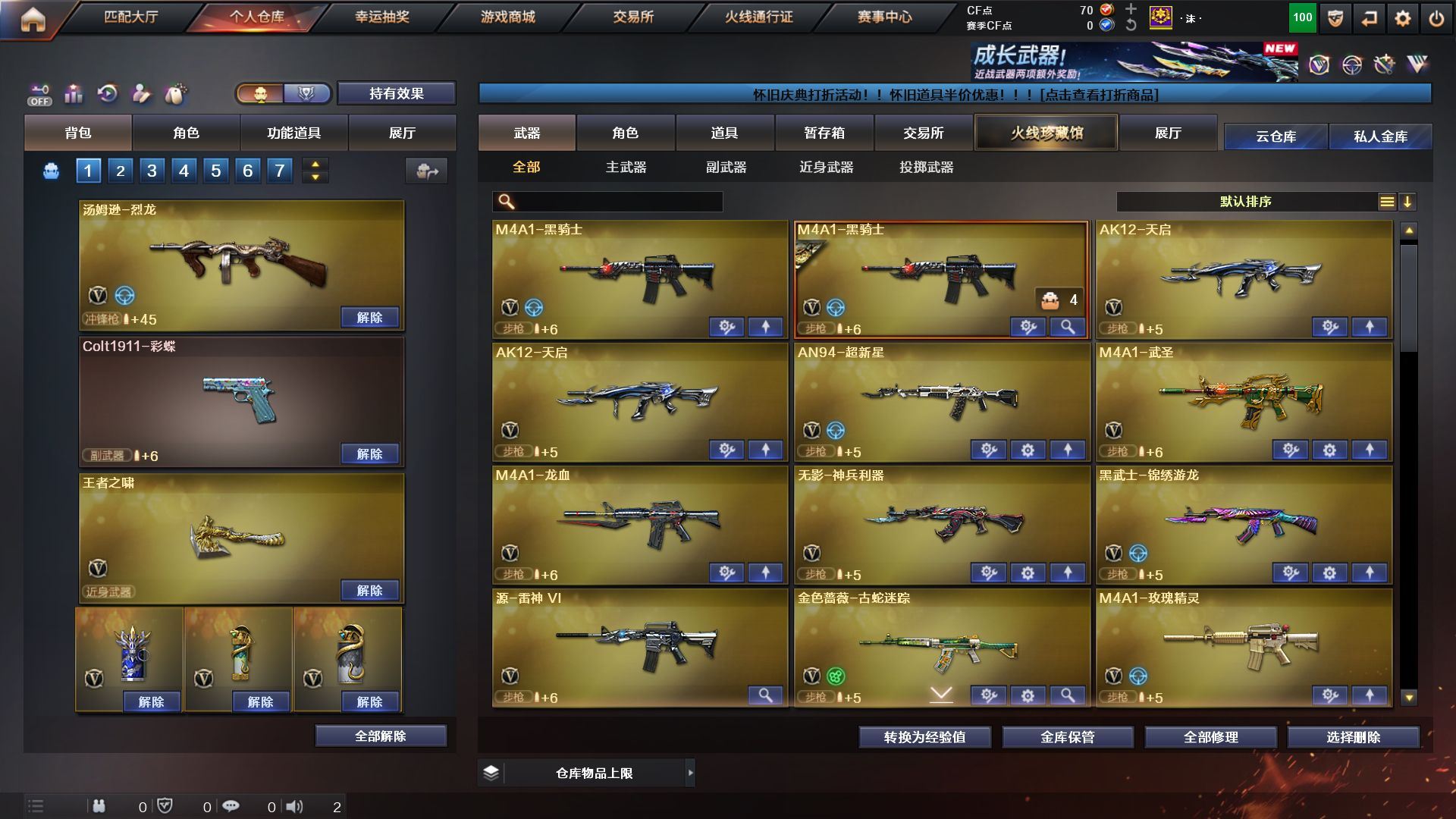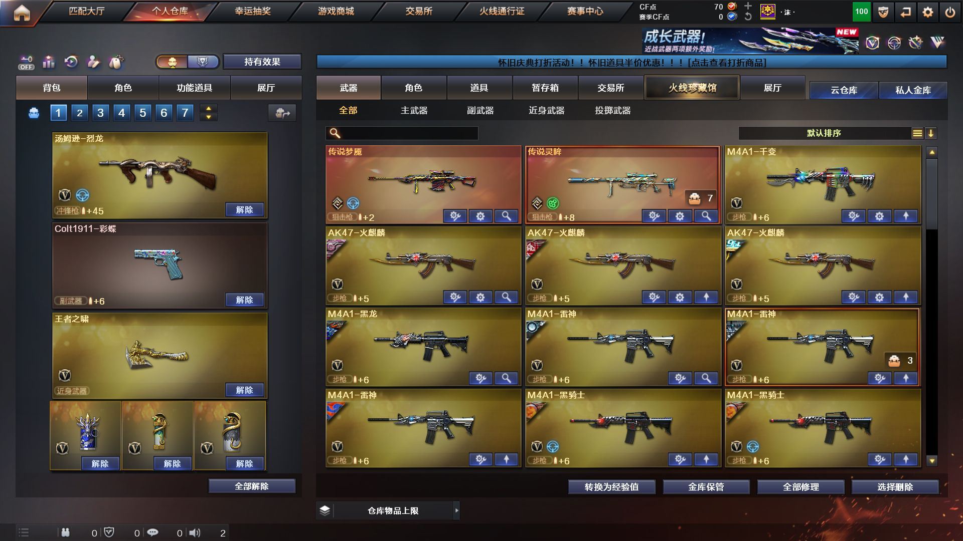 《传说灵眸/梦魇》《98k星神》《裁决》《cop旗袍 1911大黄蜂》《王者冰魄》《qbz金色蔷薇》《烈火》《毁灭》《6盘5烈》《火麒麟》《雷神》《黑骑士》《黑龙》《双面神 黑龙吞噬者》《朱雀蛇隐宗 雷神精英刀锋 火麒麟灵狐 天龙曼陀罗》《鹰 奇洋探员 蛇隐宗满配 4防王者魅影》《xrock炫彩背包 超级背包》《毁灭音效卡 极光音效卡 火麒麟音效卡 黑骑士音效卡》《火麒麟ag战队皮 火麒麟冠军之心》《a背包套装扩展券》;RPK-盘龙,QBZ03-金色蔷薇,传说灵眸,Kar98K-星神,