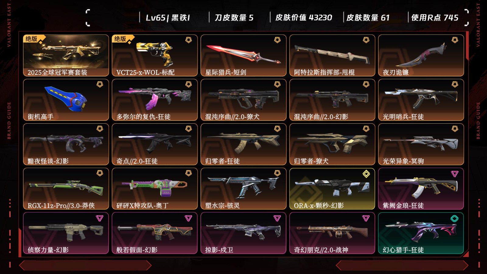 【皮肤资产价值】43230 【使用R点】745 【英雄数量】13 【皮肤数量】61 【卡面数量】71 【喷漆数量】71 【挂件数量】48 【拥有套装】2025全球冠军赛套装(2025全球冠军赛-狂徒,2025全球冠军赛-蝴蝶刀 ) 【拥有近战武器】星际猎兵-短剑/阿特拉斯指挥部-甩棍/夜刃诡镰/街机高手/ 【拥有步枪】多弥尔的复仇-狂徒/混沌序曲//2.0-獠犬/混沌序曲//2.0-幻影/光明哨兵-狂徒/黯夜怪谈-幻影/奇点//2.0-狂徒/归零者-狂徒/归零者-獠犬/ORA-x-颗秒-幻影/紫阙金琅-狂徒/侦察力量-幻影/般若假面-幻影/掠影-戍卫/幻心猎手-狂徒/星际猎兵-幻影/阿特拉斯指挥部-狂徒/甜心猎手-幻影/甜心猎手-戍卫/诛心猎手-獠犬/神罚//2.0-狂徒/瑰梦艺语-狂徒/光环序列-戍卫/悠闲猫生-幻影/太空穿梭-戍卫/悠闲猫生-獠犬/ 【拥有狙击枪】光荣异象-冥驹/RGX-11z-Pro//3.0-莽侠/星际猎兵-飞将/阿特拉斯指挥部-莽侠/诛心猎手-冥驹/甜心猎手-莽侠/光环序列-冥驹/悠闲猫生-飞将/ 【拥有机枪】砰砰X特攻队-奥丁/奇幻朋克//2.0-战神/诛心猎手-奥丁/光环序列-战神/太空穿梭-战神/ 【拥有冲锋枪】塑水宗-骇灵/无限竞技-骇灵/阿特拉斯指挥部-骇灵/甜心猎手-蜂刺/瑰梦艺语-骇灵/ 【拥有霰弹枪】星际猎兵-判官/瑰梦艺语-雄鹿/太空穿梭-判官/ 【拥有手枪】VCT25-x-WOL-标配/星际猎兵-标配/阿特拉斯指挥部-标配/诛心猎手-正义/甜心猎手-短炮/光环序列-狂怒/瑰梦艺语-鬼魅/太空穿梭-正义/悠闲猫生-短炮/ 【稀有挂件】无畏契约GO卷奇乐挂饰/无畏契约GO卷零挂饰/ 【卡面信息】势不可挡捷风卡面/无畏契约吉祥物卡面/我见识过的恐惧卡面/我眼中的世界卡面/;