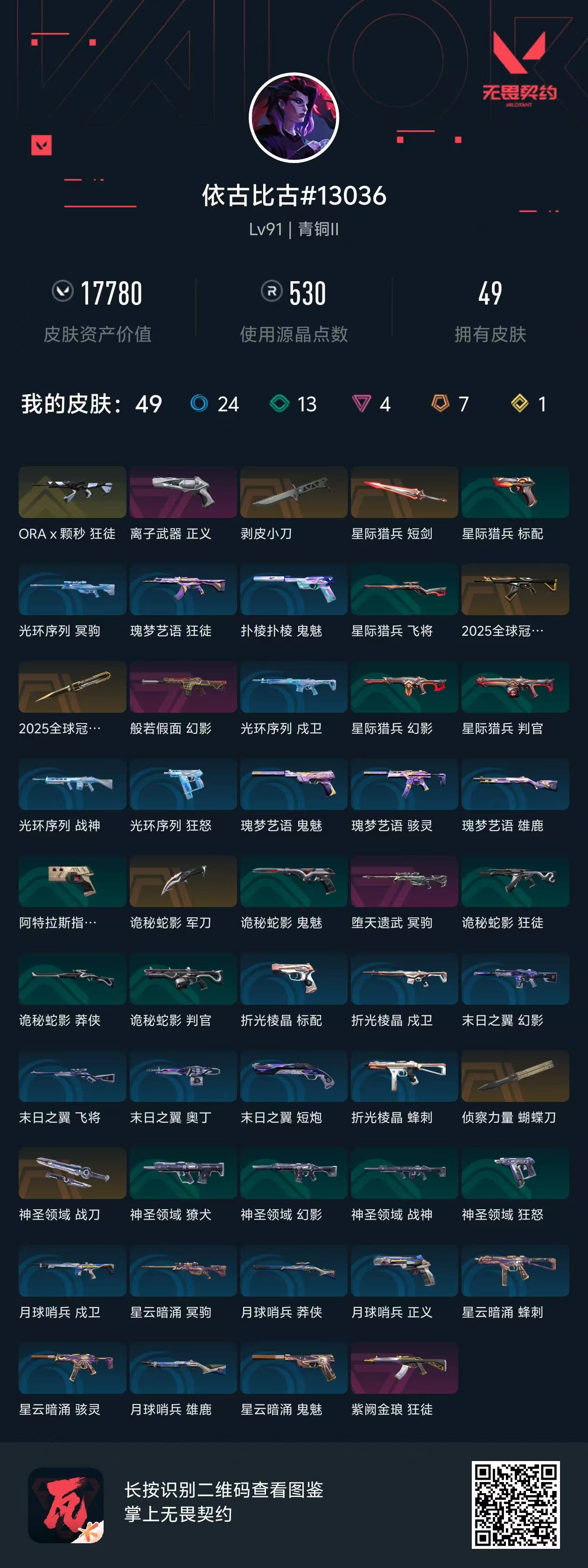 武器皮肤数量 49 英雄数量 19 卓越武器数量 4;剥皮小刀,紫阙金琅 狂徒,堕天遗武 冥驹,离子武器 正义,