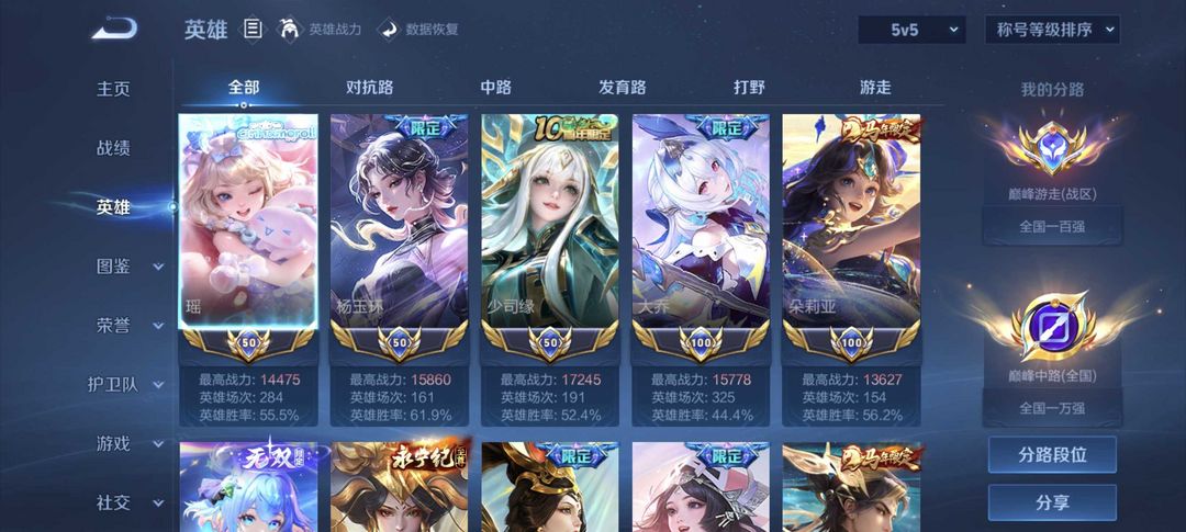 漂亮女号⚡770皮⚡全国巅峰百强辅助⚡国服瑶⚡国服朵莉亚⚡国服少司缘⚡国服大桥