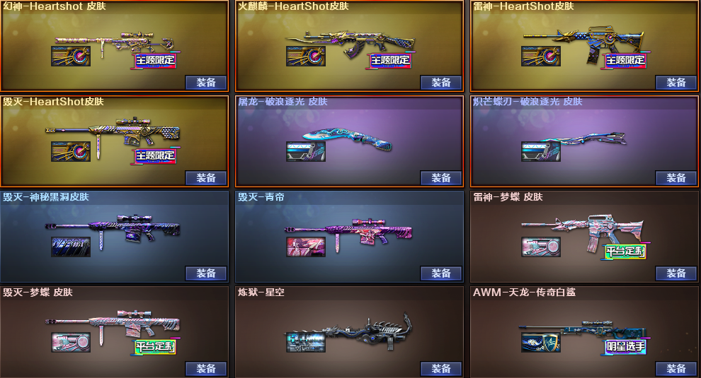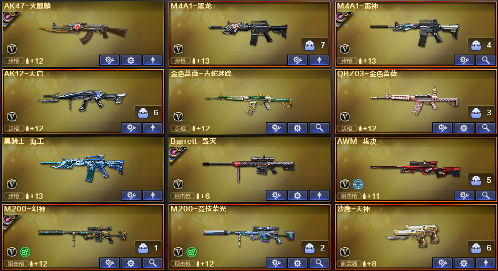 爆破全装,幻神,蝴蝶刀,幻神+哈拉少,雷神+哈拉少,火麒麟+哈拉少,毁灭+哈拉少。;炽芒蝶刃,隼,电竞教官-云悠悠,QBZ03-金色蔷薇,M200-幻神,