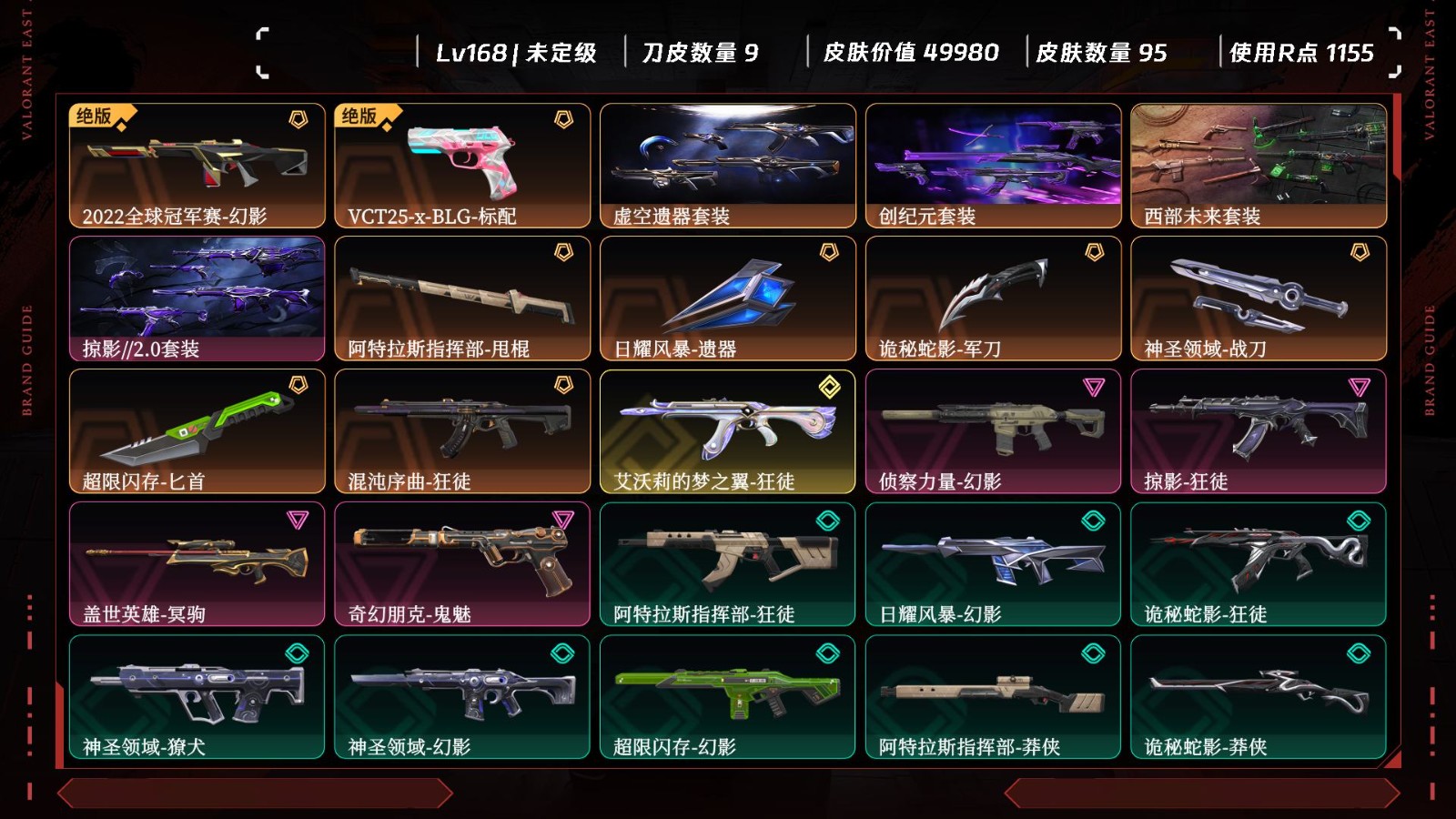 【皮肤资产价值】49980 【使用R点】1155 【英雄数量】27 【皮肤数量】95 【卡面数量】142 【喷漆数量】125 【挂件数量】96 【拥有套装】掠影//2.0套装(掠影//2.0-幻影,掠影//2.0-奥丁,掠影//2.0-骇灵,掠影//2.0-鬼魅,影钩)虚空遗器套装(虚空遗器-狂徒,虚空遗器-幻影,虚空遗器-判官,虚空遗器-正义,源始幻刃)西部未来套装(西部未来-幻影,西部未来-奥丁,西部未来-飞将,西部未来-正义,未来开拓者)创纪元套装(创·纪元-狂徒,创·纪元-莽侠,创·纪元-骇灵,创·纪元-正义,镭切) 【拥有近战武器】阿特拉斯指挥部-甩棍/日耀风暴-遗器/诡秘蛇影-军刀/神圣领域-战刀/超限闪存-匕首/ 【拥有步枪】2022全球冠军赛-幻影/混沌序曲-狂徒/艾沃莉的梦之翼-狂徒/侦察力量-幻影/掠影-狂徒/阿特拉斯指挥部-狂徒/日耀风暴-幻影/诡秘蛇影-狂徒/神圣领域-獠犬/神圣领域-幻影/超限闪存-幻影/悠闲猫生-獠犬/太空穿梭-戍卫/悠闲猫生-幻影/幻语魔咒-獠犬/甜蜜战术-戍卫/末日之翼-幻影/折光棱晶-戍卫/月球哨兵-戍卫/模拟赫兹-獠犬/浮光跃金-戍卫/ 【拥有狙击枪】盖世英雄-冥驹/阿特拉斯指挥部-莽侠/诡秘蛇影-莽侠/超限闪存-莽侠/悠闲猫生-飞将/幻语魔咒-飞将/甜蜜战术-冥驹/末日之翼-飞将/星云暗涌-冥驹/月球哨兵-莽侠/模拟赫兹-冥驹/ 【拥有机枪】日耀风暴-奥丁/神圣领域-战神/太空穿梭-战神/末日之翼-奥丁/浮光跃金-战神/ 【拥有冲锋枪】阿特拉斯指挥部-骇灵/日耀风暴-骇灵/超限闪存-蜂刺/折光棱晶-蜂刺/星云暗涌-蜂刺/星云暗涌-骇灵/浮光跃金-骇灵/ 【拥有霰弹枪】诡秘蛇影-判官/太空穿梭-判官/幻语魔咒-雄鹿/甜蜜战术-判官/月球哨兵-雄鹿/模拟赫兹-雄鹿/ 【拥有手枪】VCT25-x-BLG-标配/奇幻朋克-鬼魅/星际猎兵-标配/阿特拉斯指挥部-标配/日耀风暴-正义/诡秘蛇影-鬼魅/神圣领域-狂怒/超限闪存-正义/游戏结束-正义/太空穿梭-正义/悠闲猫生-短炮/幻语魔咒-狂怒/甜蜜战术-鬼魅/折光棱晶-标配/末日之翼-短炮/星云暗涌-鬼魅/月球哨兵-正义/纳米-正义/浮光跃金-标配/模拟赫兹-鬼魅/ 【稀有挂件】无畏契约GO卷捷风挂饰/无畏契约GO卷奇乐挂饰/无畏契约GO卷零挂饰/V25第六幕黄金挂饰/金属蝶翼挂饰/第九季白银挂饰/终章猫猫木乃伊挂饰/拳击战术熊挂饰/无畏契约GO卷芮娜挂饰/熔岩灯挂饰/迷你浓缩挂饰/袖珍捷风挂饰/第八季黑铁挂饰/幸运中国结挂饰/ 【卡面信息】势不可挡幽影卡面/我眼中的世界卡面/我见识过的恐惧卡面/分崩离析卡面/西部未来卡面/先驱者卡面/清风徐来卡面/双城之战拥抱卡面/;
