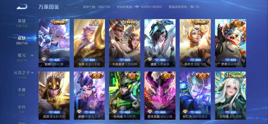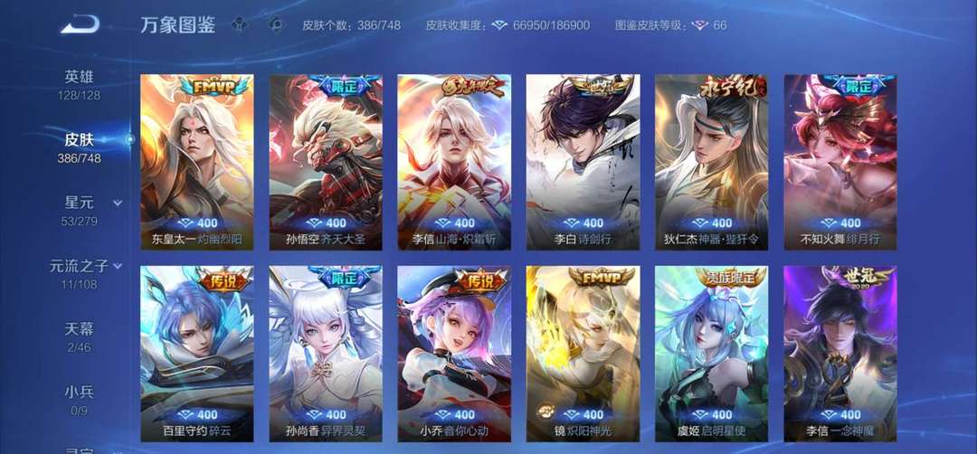 女生号 贵10 多皮肤多传说 别拿那些空号v10来比 要看性价比 貂蝉武则天夏侯惇孙悟空李白鲁班小乔荣耀水晶 妲己九尾无双皮肤 80个传说 473皮肤