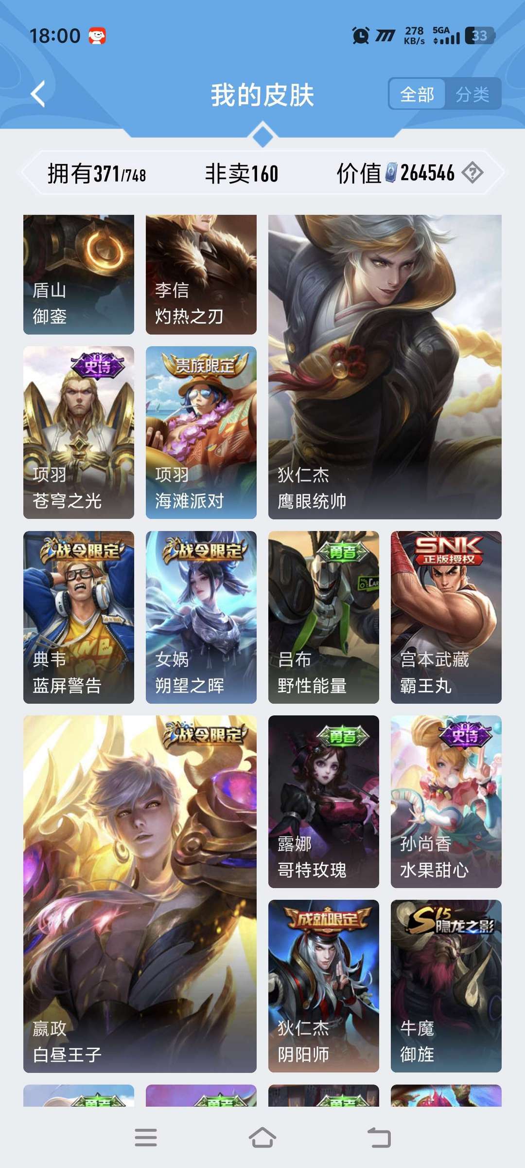 上不去看最后一张图贵族10,695皮伽罗典藏124传说,7无双,7珍品,群星魔术团,落雪白狼,龙年全满,曦炫引,战鼓燎原时之奇旅,隐龙天啸,妄想实况,琥珀纪元