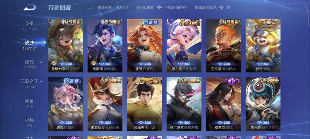 1个荣耀典藏,4个珍品传说,7个传说,58个史诗,65个限定,99个勇者,满铭文