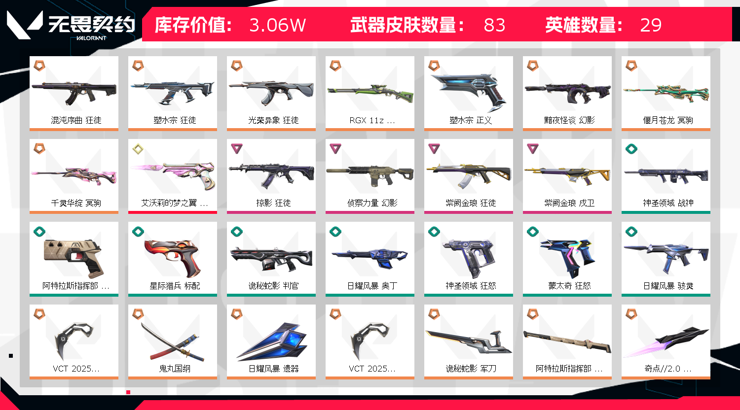 首页 > 租号大厅 > 无畏契约-wegame > wegame/wegame > vct爪/奇点蝴蝶/混沌/塑水/紫金/光荣异象狂徒/古神/侦查幻影/苍龙大狙