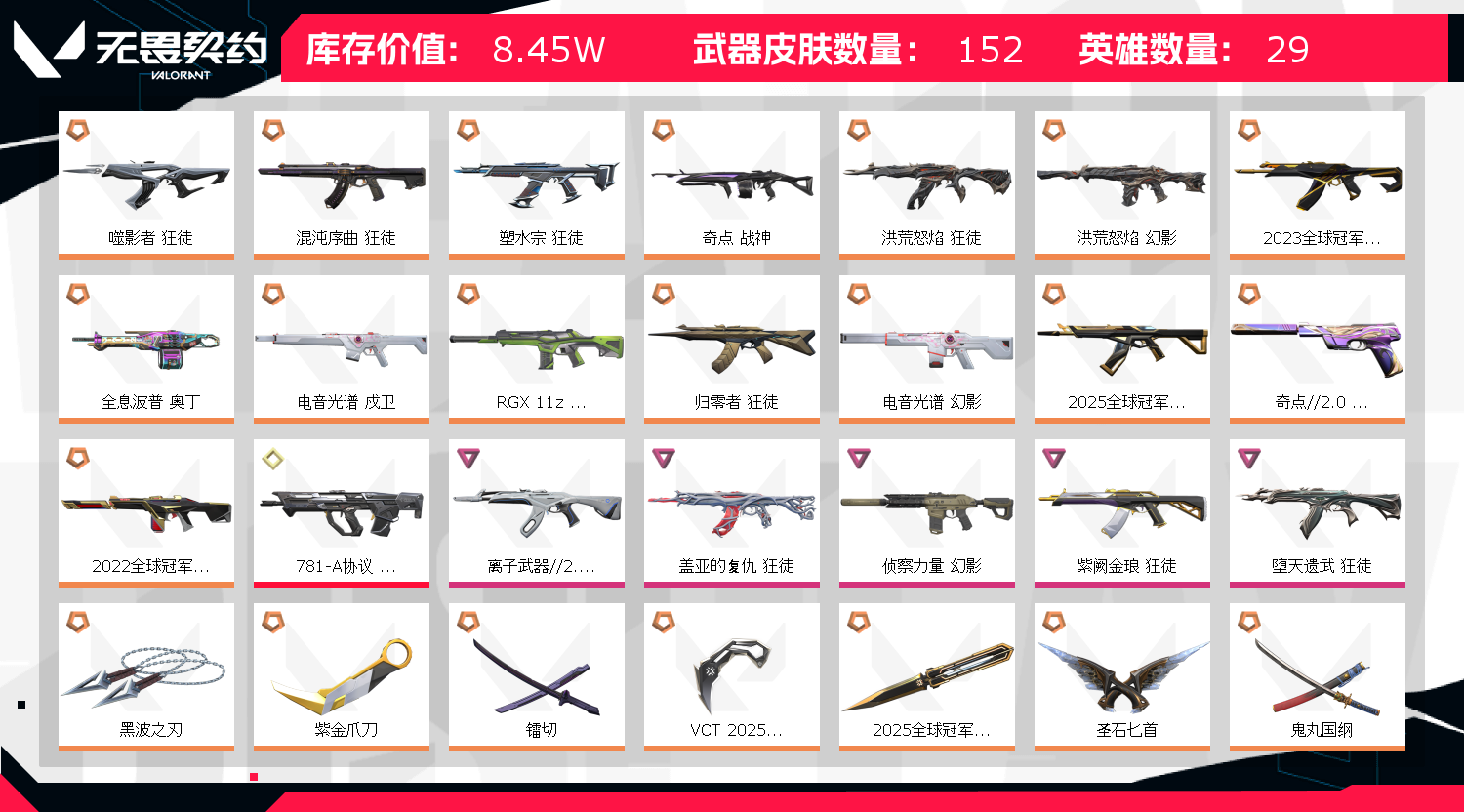 首页 > 租号大厅 > 无畏契约-wegame > wegame/wegame > 精氪毕业皮齐全特效炫彩拉满⚡22·25冠军套显卡紫金爪VCT黑波圣石⚡盖亚23ak混沌塑水流脓⚡侦查