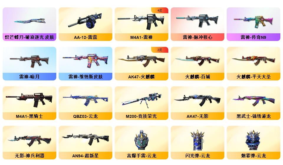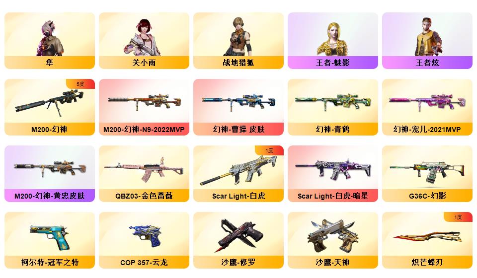 幻神宠儿/炽芒蝶刃破浪逐光/G36C幻影西部/陕西一区/可排位/幻神/幻神拉丝/幻神N9/幻神青鹤/幻神曹操/幻神电流骇客/幻神黄忠/王者幻神/M200竞技荣光/柯尔特冠军之特/炽芒蝶刃/QBZ金色蔷薇/金色蔷薇枪娘阿敏/白虎/白虎暗星/青龙之魄/天龙/毁灭/黑骑士/雷神/火麒麟/【小人枪】/火麒麟灵狐/毁灭孙三炮/天龙曼陀罗/炼狱枪娘掣电/迷你宝贝/KAC锯式机枪黑桃战神/【四防已开】