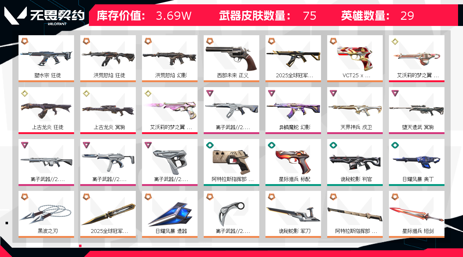 首页 > 租号大厅 > 无畏契约-wegame > wegame/wegame > 25冠军套/离子套/黑波/流脓/塑水狂徒/魔蛇幻影皮肤精品