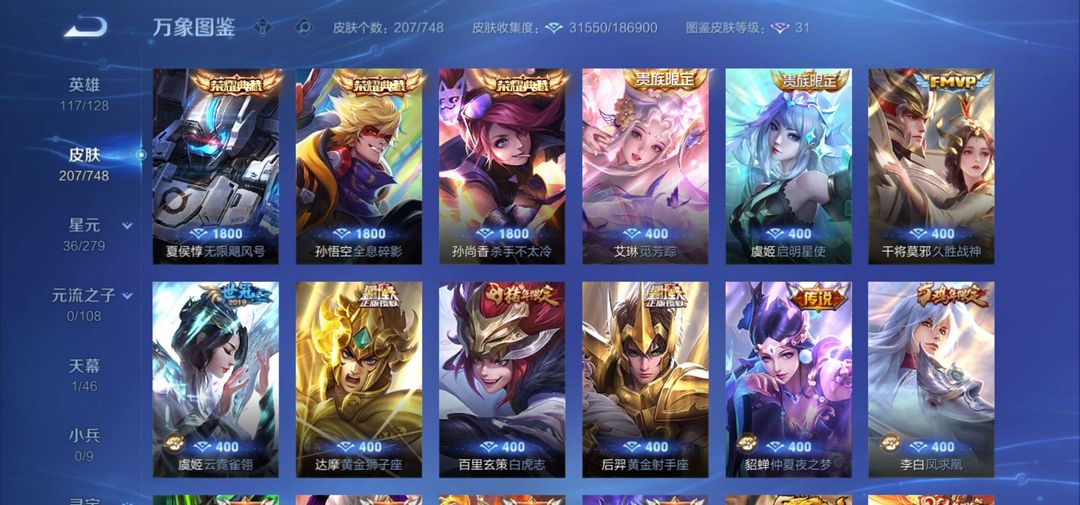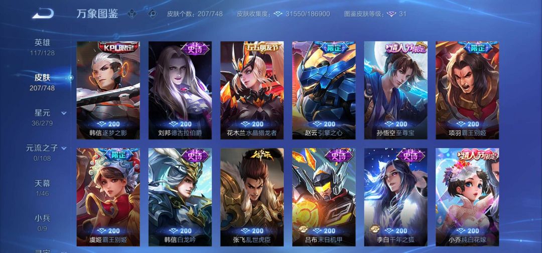 v10、509皮、刘备星传说时之思念、韩信荣耀典藏、瑶珍品传说大耳狗之梦、青丘·九尾、星域神启、画中仙、深海之息、天魔缭乱