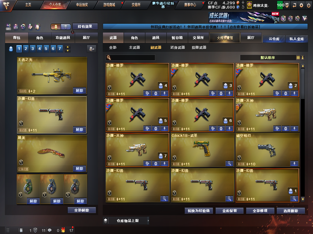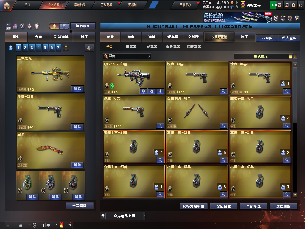 【主武器】QBZ95-幻兽/裁决/👂炼狱/⑥烈龙⑥盘龙/千变/⑤火麒麟/③黑龙/⑦雷神/②黑骑士/②无影/②死神/②黑武士/天启/超新星/武圣/机械迷城/②玫瑰精灵/猎神/⑤天龙/③毁灭/④极光/王者之怒觉醒版/王者之魄/王者之心/王者之武/王者之影/王者之光/炫金天龙/王者之力/炫金毁灭/炫金天龙/3级泰坦破坏者/毒刺-金线/加特林机械猎手/死亡之眼/巧克力斯太尔 【副武器}】⑤沙鹰幻兽/5修罗/2天神/破空枪刃夜魔/武圣手枪/2王者之魂/炫金修罗/usp-竞魄/cop旗袍 【近身武器】④屠龙/龙啸/③擎天/④麒麟刺/女皇利刃幻兽/王者之峰/王者之击/迷你钢铁终结者 【投掷武器】⑦套高爆幻兽/⑦高爆幻兽+⑦幻兽闪光+⑦幻兽烟雾/ 【角色】蝴蝶/葵/零/审判者/瞳/樱/魅影/零纪元/王者零/王者之瞳/海豹突击队/对讲机/炫彩背包/圣灵戒/魔龙戒 【皮肤】毁灭-耀金皮肤/雷神-星空皮肤/ 【音效卡】毁灭音效卡 【道具】紫金大元首/全背包/AC/烟雾头/VIP6/变异宝贝/步枪/机枪/手枪弹夹/爆破号;RPK-盘龙,