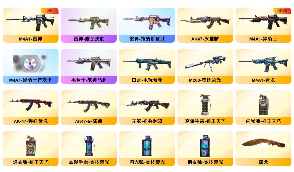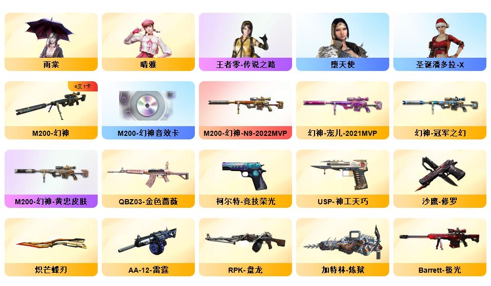 【幻神-宠儿、幻神音效卡】【蝴蝶刀】传说夜影、白虎电玩蓝兔、炼狱小刚、竞技荣光套装;【重要角色9】:晴雅/兰-巾帼英雄/雨棠/王者-零-传说之路/奇洋探员/超能女侍/灵动武士/暗黑审判/女主播;【武器皮肤11】:M200-幻神-N9-2022MVP/幻神-宠儿-2021MVP/幻神-冠军之幻/M200-幻神-黄忠/毁灭-黑曼巴/毁灭-墨兰/雷神-维纳斯/黑骑士-战神马超/火麒麟-CFSTAR/