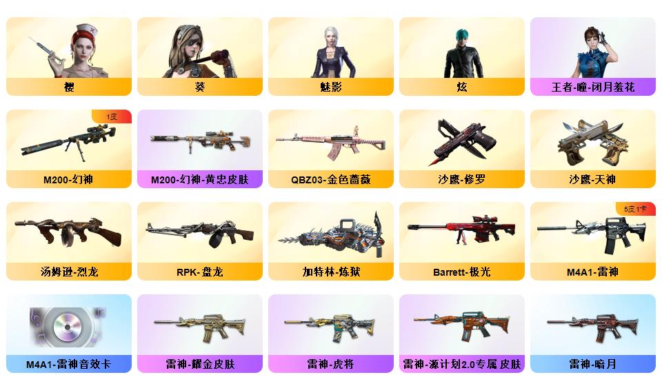 【6盘7烈】【M200-幻神-黄忠】cat猫猫枪100V,【重要角色8】:炫/魅影/樱/葵/王者-瞳-闭月羞花/修道士/零-水下丽影/樱-青春偶像;【武器皮肤43】:/毁灭-墨兰/极光-能量核心*2/雷神-源计划2.0专属/M4A1-千变-孔明/黑龙-暗月*3/M4A1-黑龙-361/雷神-虎将/黑骑士-暗月/黑龙-能量核心/雷神-能量核心/雷神-暗月/火麒麟-CFSTAR*2/火麒麟