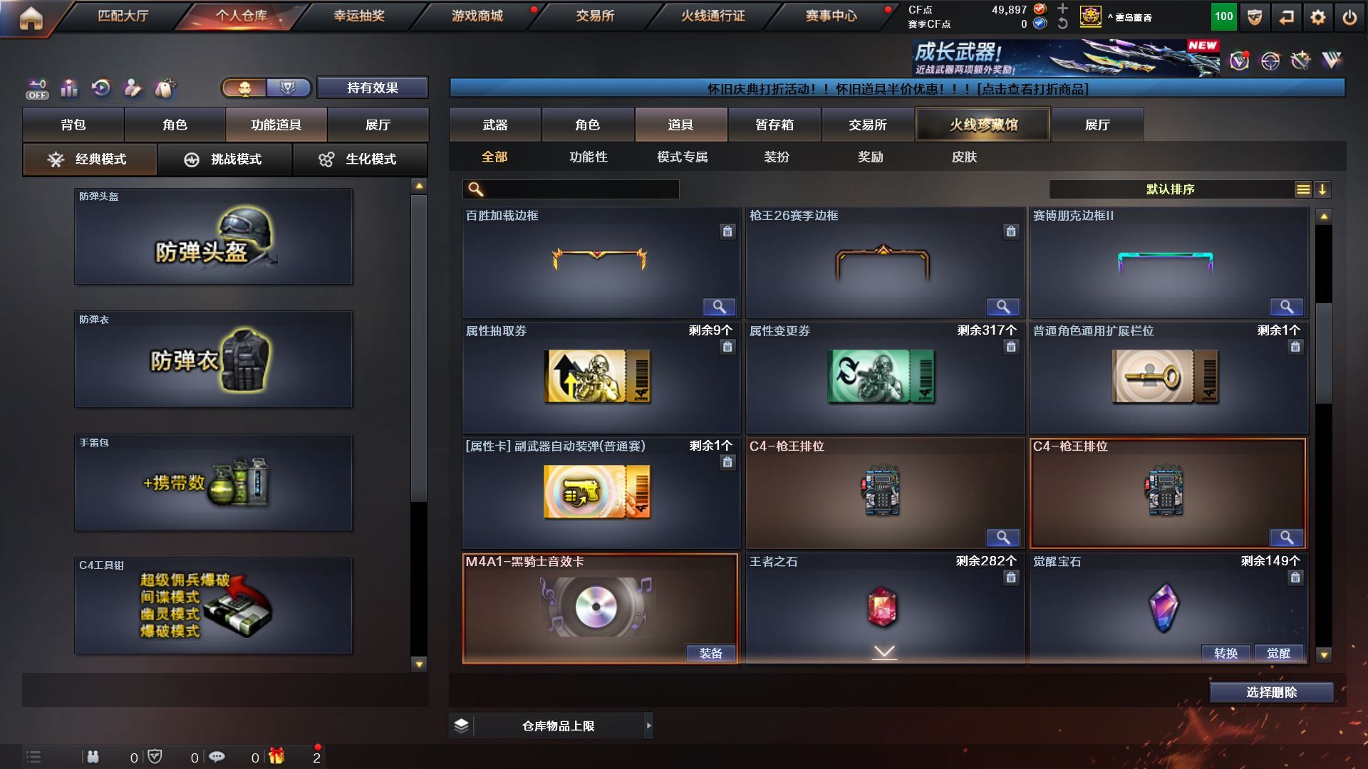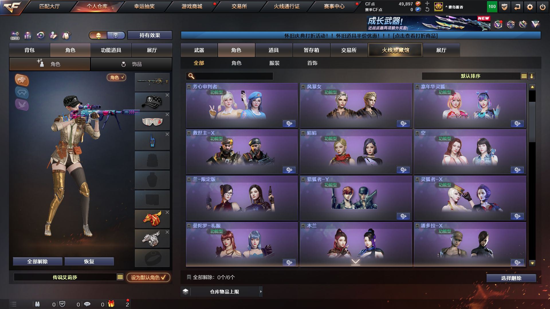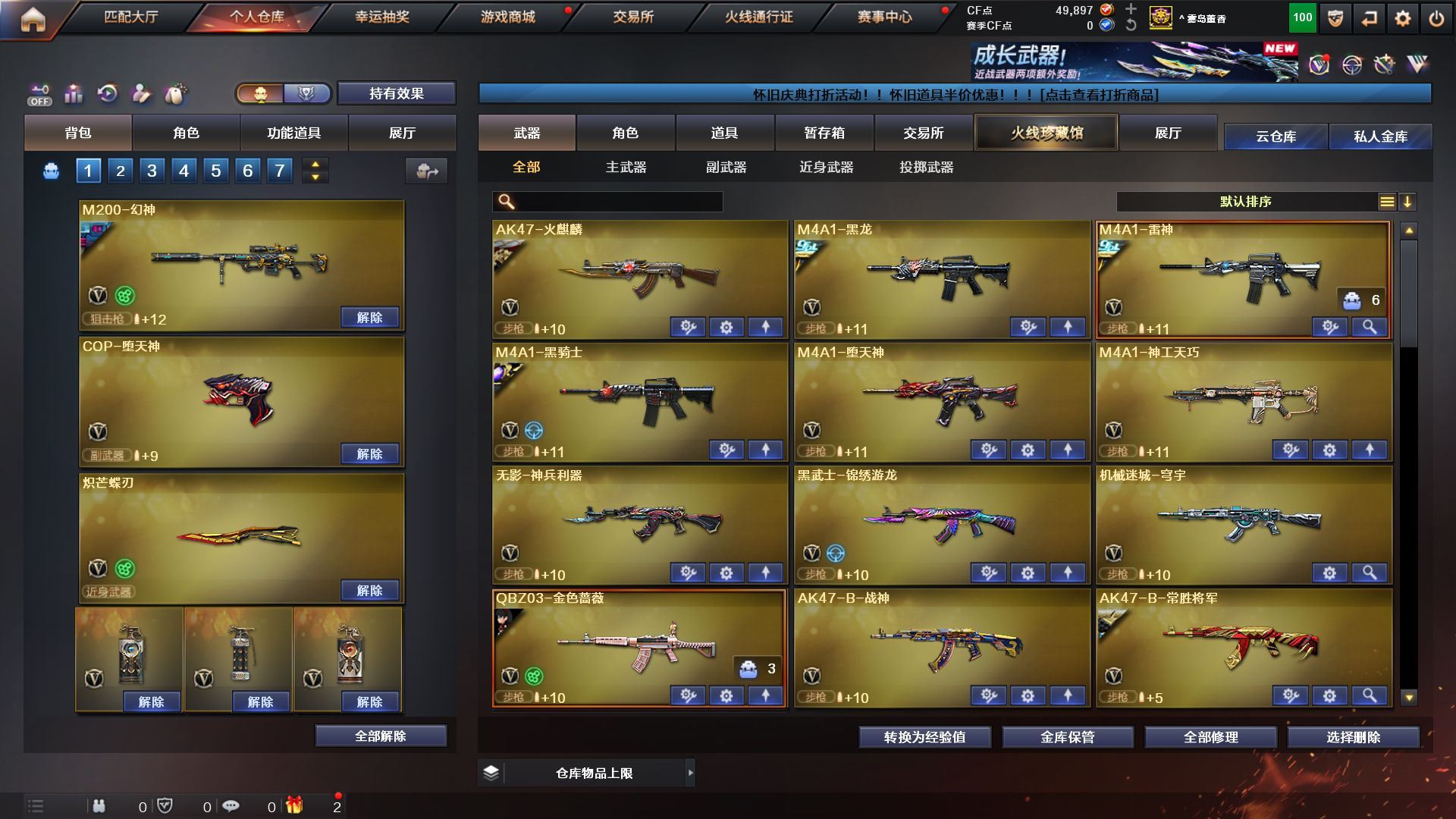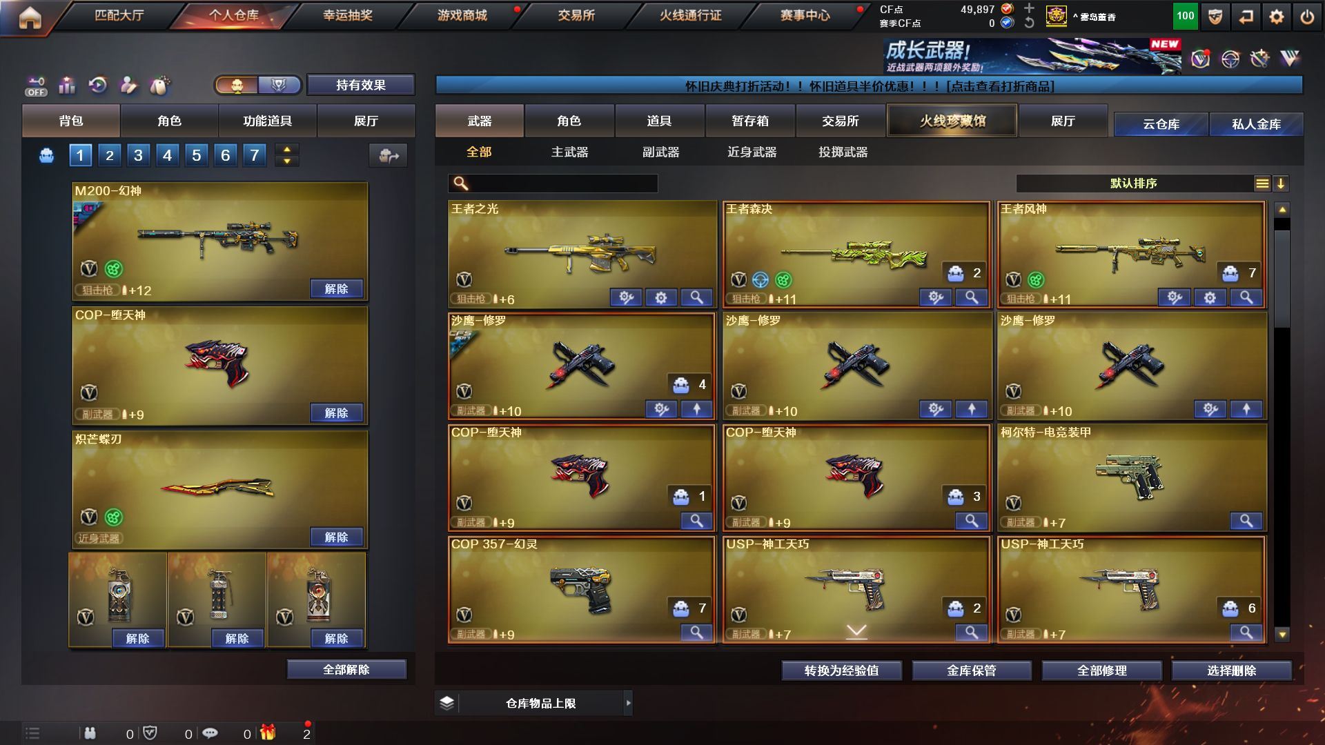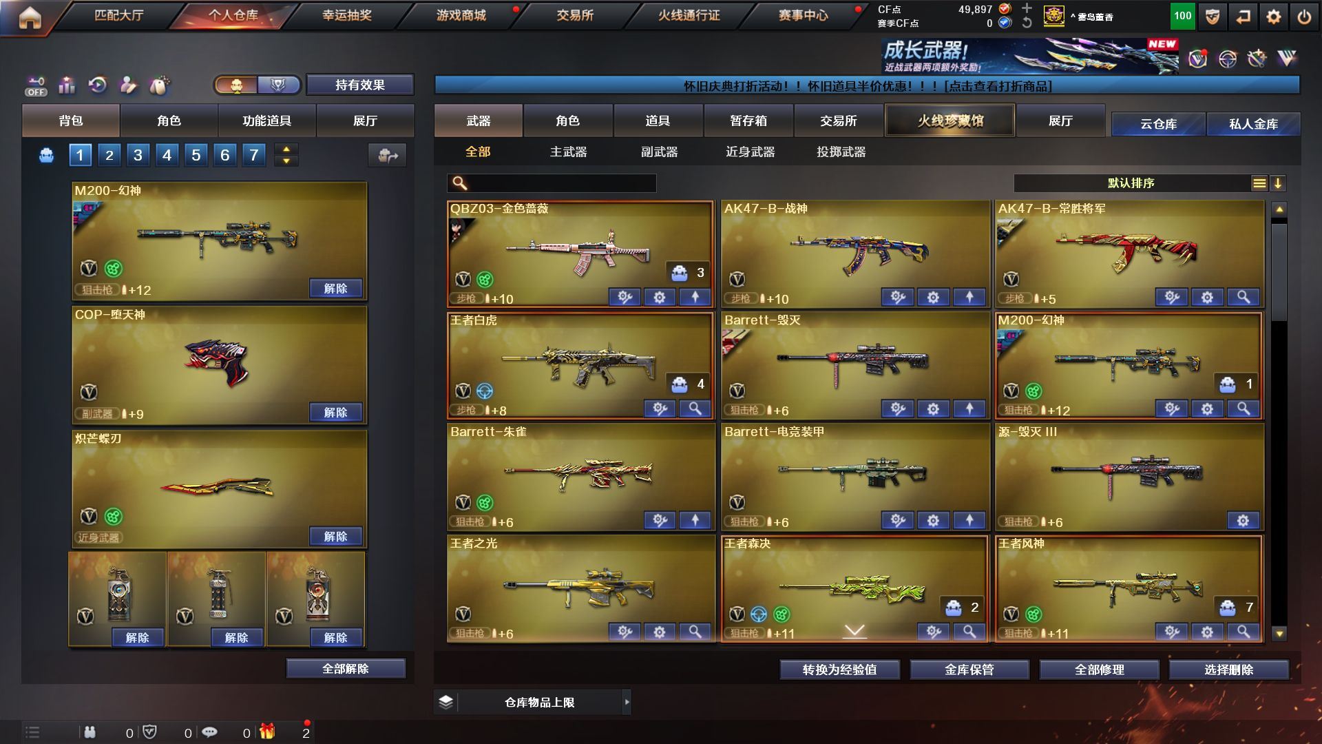 4防传说艾莉莎》《m200幻神+荣耀世冠白鲨+黄忠》《王者风神/森决》《cop堕天神 柯尔特电竞装甲 cop幻灵 usp神工天巧 cop旗袍》《炽芒碟刃》《堕天神套 神工天巧套》《王者白虎》《qbz金色蔷薇》《毁灭》《火麒麟》《雷神》《黑骑士》《黑龙》《雷神精英刀锋》《4防关小雨 4防雨棠 4防隼 乔伊教练》《b s战队炫彩背包 kz战队炫彩背包 xrock炫彩背包》《黑骑士伏羲 黑龙冠军之武 qbz03agcfpls19 雷神冠军之魄 毁灭冠军之怒 毁灭svcfpls16》《永久ac 永久工具钳 永久手雷包;炽芒蝶刃,隼,传说艾莉莎,QBZ03-金色蔷薇,M200-幻神,