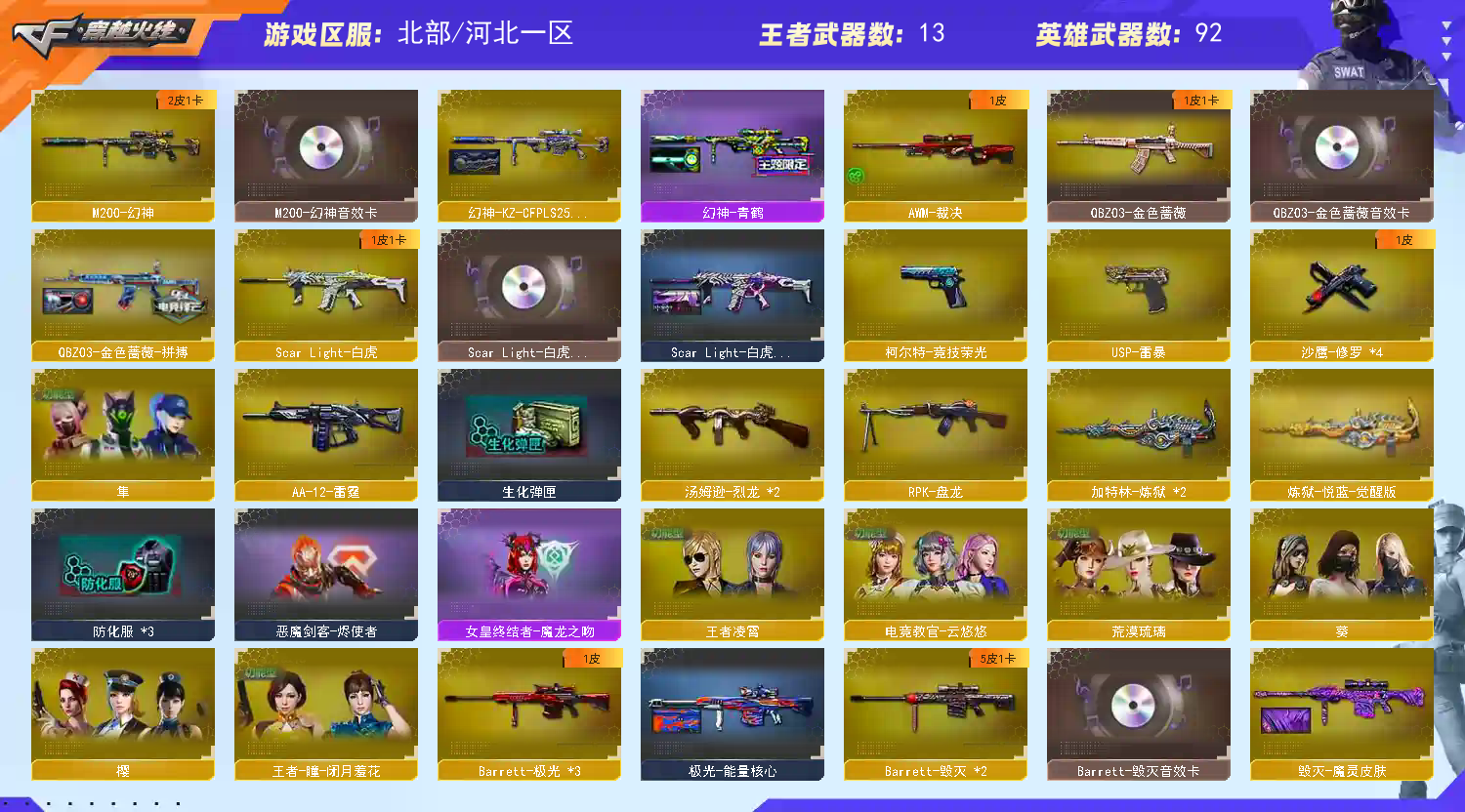 首页 > 租号大厅 > 穿越火线 > 北部/河北一区 > 幻神KZ青鸾+幻卡❤️QBZ蔷薇白虎三件套竞技荣光全套USP雷暴王者星神❤️AWM裁决⑦音效卡