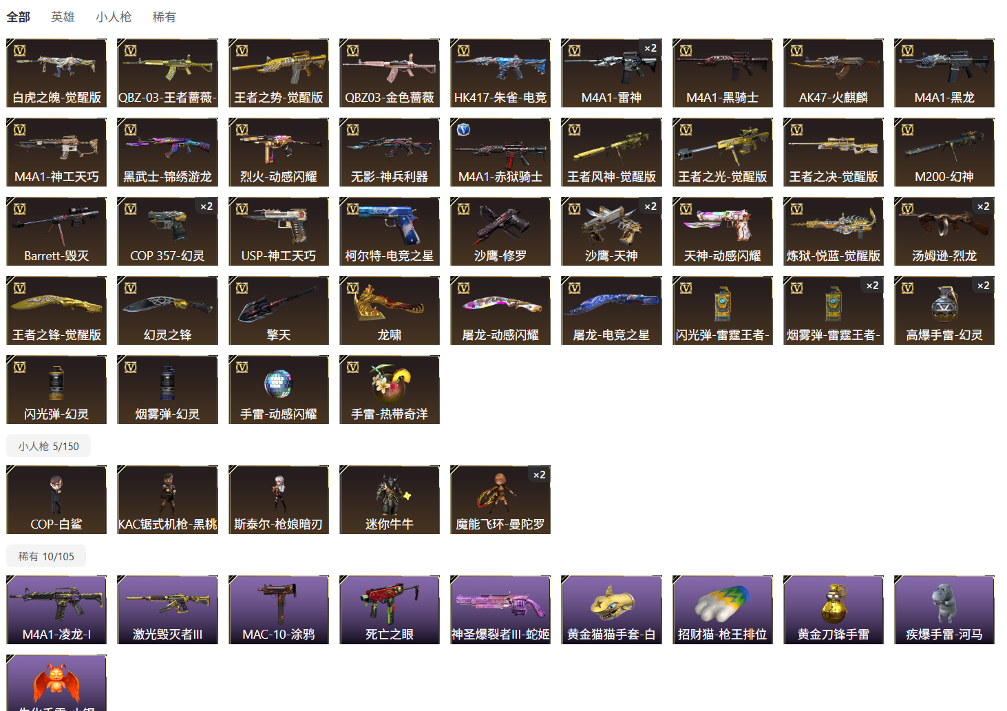 VIP6 50V,4王者,幻神世冠白鲨/毁灭英雄计划 /毁灭冠军之怒/毁灭战神张飞/毁灭星空/极光能量核心/火麒麟CFSTAR/火麒麟华夏之心/火麒麟心动糖果/火麒麟轻羽/荒漠琉璃/_晴雅/战地猎狐/幻面灵狐/M200-幻神/Barrett-毁灭/王者之光-觉醒版/王者之决-觉醒版/M4A1-神工天巧/M4A1-雷神音效卡/M4A1-黑骑士音效卡;晴雅,RPK-盘龙,QBZ03-金色蔷薇,M200-幻神,