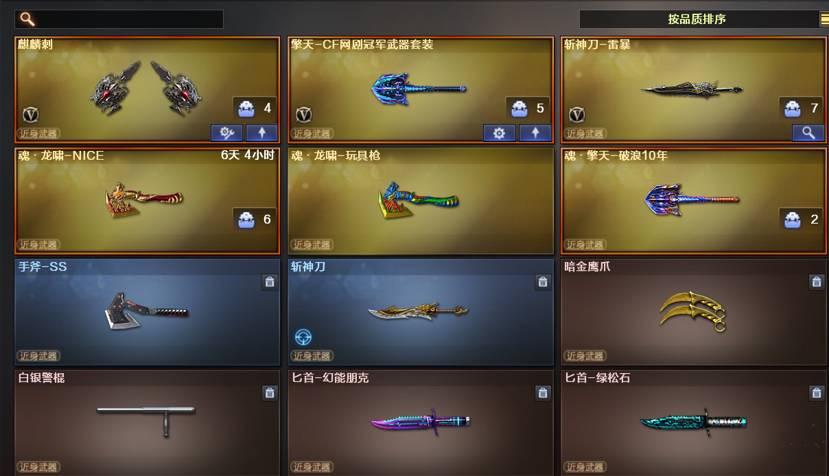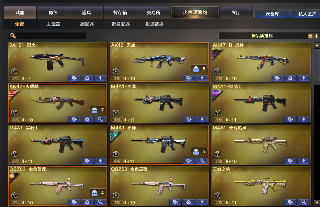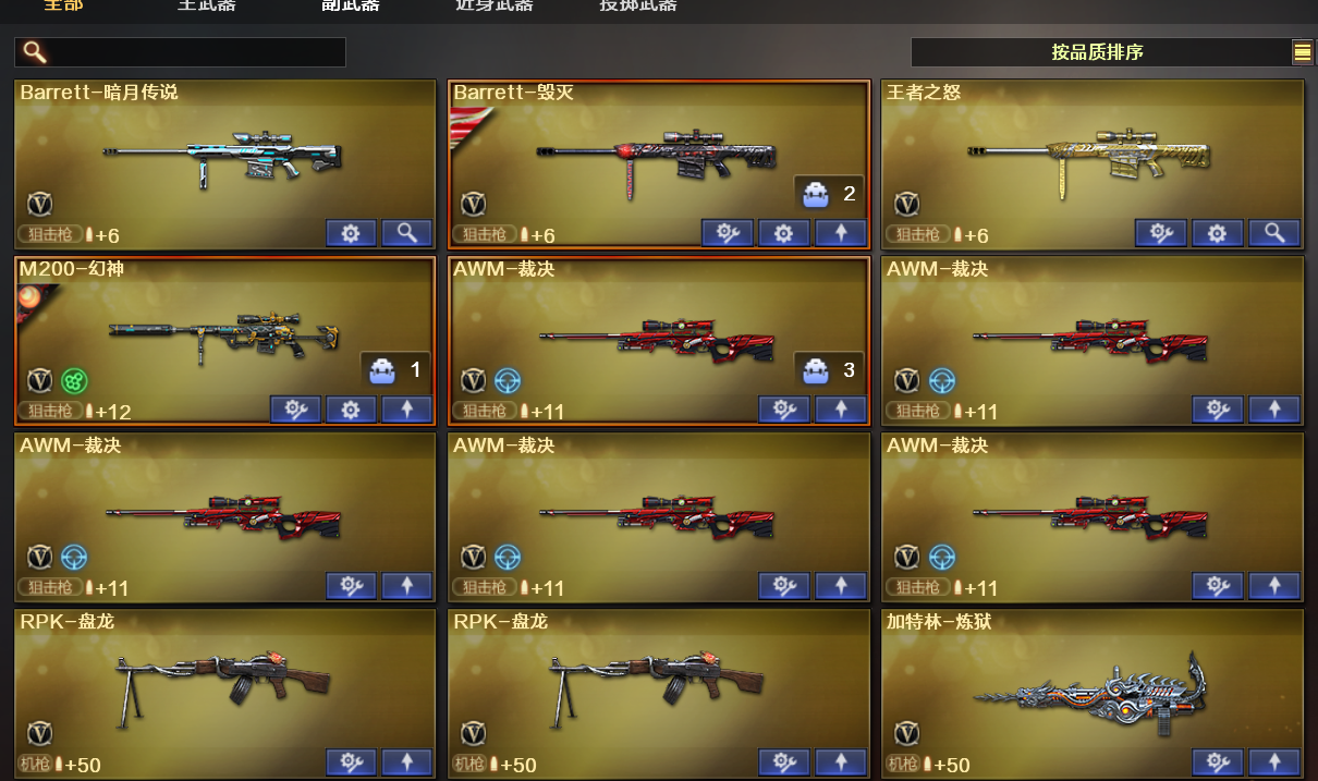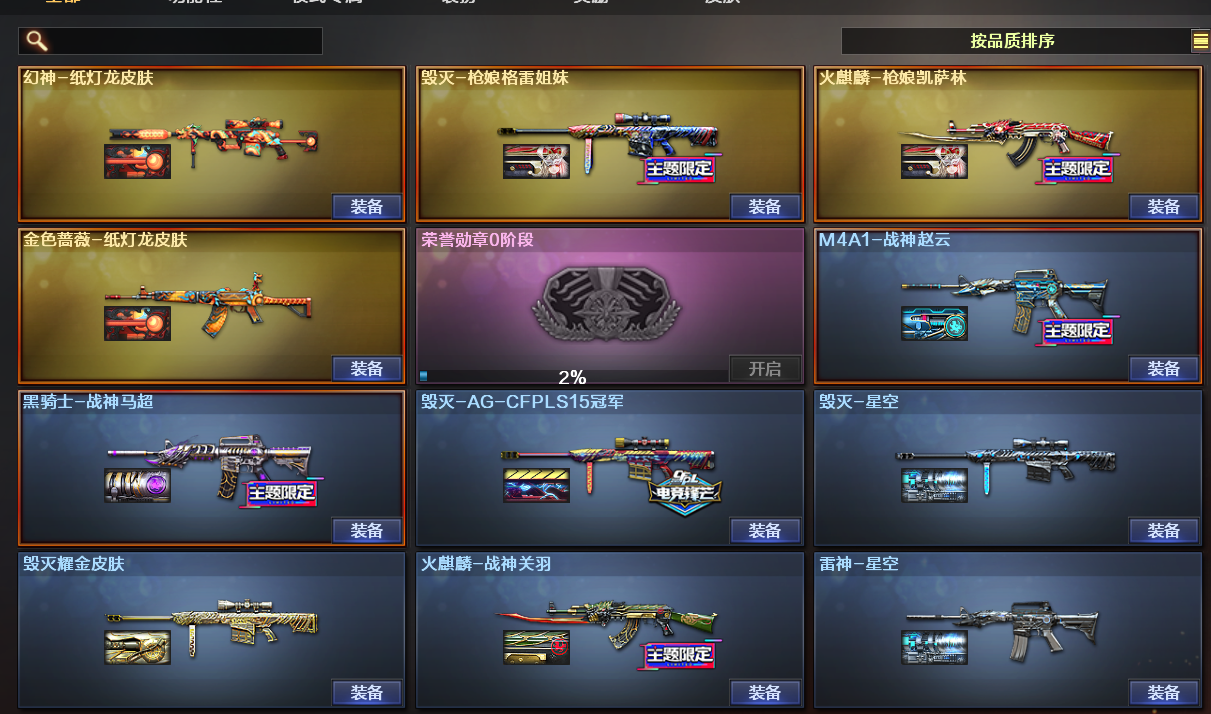 火麒麟枪娘-AG-平天-关羽-CF STAR-华夏之心 幻神-纸灯笼 毁灭-枪娘-炫金-AG-星空-音效卡 雷神-星空-耀金-赵云-音效卡 三防-王者春-副武器自动换单;USP-雷暴,RPK-盘龙,QBZ03-金色蔷薇,M200-幻神,