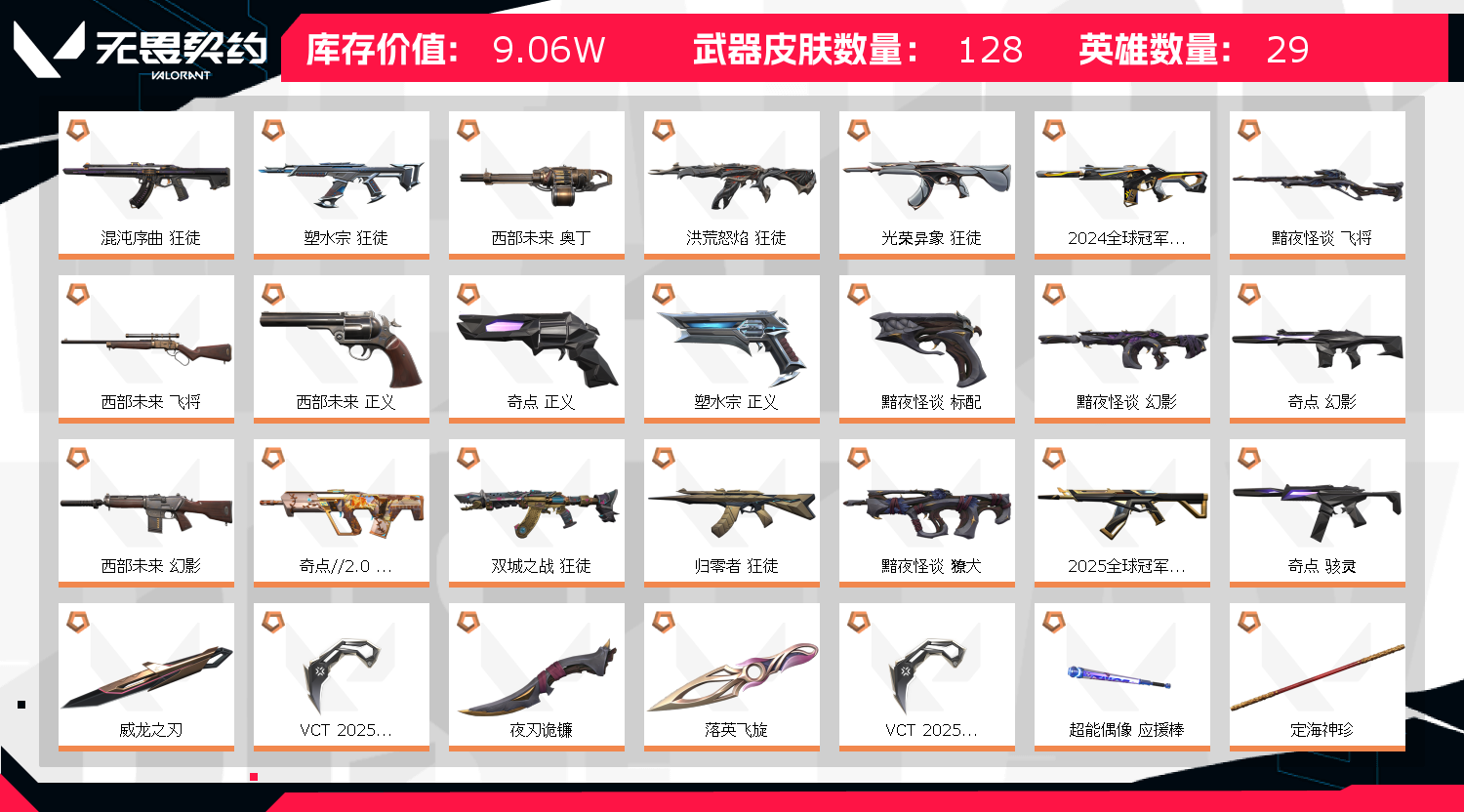 郑重声明:若出现 账号封禁/毁号等情况,本人商户多年,所属账号已在派出所备案,经过网络财产备案价值! 使用外挂脚本导致游戏账号封禁直接向平台提取ip地址!一经发现直接报警处理立案追责,根据账号价值追究其法律责任! 请租客文明游戏,不要开挂或挂机!切勿心存侥幸!因无畏契约检测严格,为防止后台插件导致封号,上号前请务必重启电脑! 注意事项:出现冻结,我们看到后会及时解冻。等5-10分钟重新登陆即可 1.登陆界面稍等2分钟会上去(自动登录)老板不要着急,一次不行多来几次wegame界面要耐心等2分钟 2.密令会自动输入如果一次不成功多来几次。 3..进入wegame后到弹短信验证处,关闭掉,重新下载无畏契约这个游戏即可成功上号,记住。这个方法百分百上号成功!就是进入wegame重新下载无畏契约游戏 !!!百分百成功!! 4.请及时续租不要挂机,到时不下线,但是下一个会挤号导致挂机,所以请及时续租,导致禁赛的一律拉黑 。 5.祝老板玩的愉快,喜欢可以收藏关注;西部未来 奥丁,威龙之刃,VCT 2025 爪刀,盖亚的复仇 狂徒,掠影 戍卫,洪荒怒焰 狂徒,掠影 狂徒,