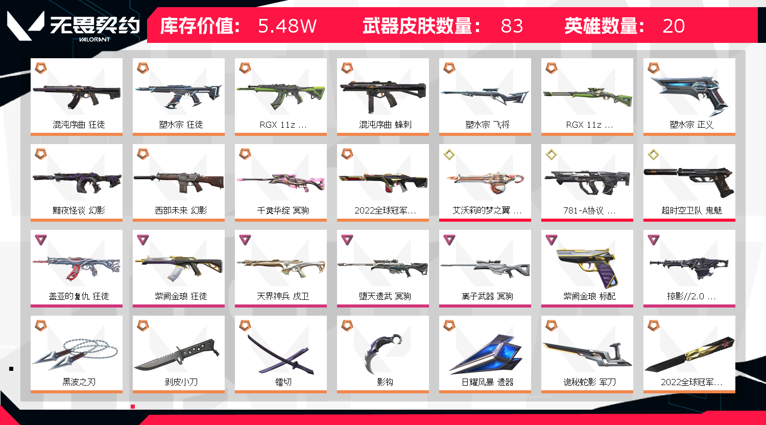 允许 英雄17 武器皮肤数量81;艾沃莉的梦之翼 奥丁,黑波之刃,剥皮小刀,镭切,盖亚的复仇 狂徒,紫阙金琅 狂徒,RGX 11z Pro 狂徒,