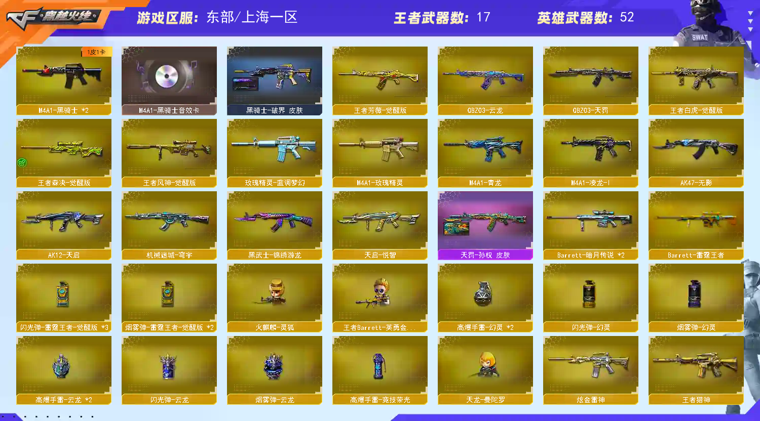 63v17王者2炫金可排位【云龙套/传说破晓/M200幻神+幻神宠儿+幻神-N9-2022MVP+幻神丹凤+幻神曹操+幻神紫橙光效/王者风神-觉醒版/M4A1-青龙/Scar Light-白虎/QBZ03-天罚/QBZ03-云龙/QBZ03-金色蔷薇/王者白虎-觉醒版/VSK-94-金蚀/2天神/COP357-幻灵/2把COP357-云龙/云龙扇/1套幻灵雷/1套云龙雷/2套雷霆王者雷/】【天罚音效卡/毁灭音效卡/黑骑士音效卡/雷神音效卡/金色蔷薇音效卡/超新星-热带奇洋-热带奇洋音效卡/】【/金色蔷薇-Heartshot皮肤/QBZ03-CFS2024皮肤/雷神-刘备皮肤/天罚-孙权皮肤/雷神-CFS十周年纪念版皮肤/裁决-流光秘银/毁灭-星空/毁灭-AG-CFPLS15冠军/毁灭-战神张飞/火麒麟-战神关羽/雷神-宠儿-2019MVP/黑骑士-破界皮肤/修罗-CFSTAR/黑龙-墨子皮肤/火麒麟-CFSTAR/天龙-CFSTAR/修罗-冠军之魂/】【四防】隼/关小雨/奇洋探员/修道士/葵-赛博朋克/】【/王者芳薇-觉醒版/王者猎神/王者之势/Barrett-雷霆王者/王者Barrett-英勇金戈/王者森决-觉醒版/雷霆王者之锋/炫金雷神/炫金天神/火麒麟-灵狐/雷神-小红/天启-悦智/天龙-曼陀罗/星神-炽天使/MK5-炽火炎龙/毒蜂/巡航者/Scar Light-马枪/巴雷特-零-水下丽影/COP-旗袍/】【闪光护目镜/胡司令玩偶/超级背包3-7/炫彩背包/小蛙蛙袋/全背包/永久防弹衣防弹头盔手雷包C4工具钳;隼,QBZ03-金色蔷薇,M200-幻神,Scar Light-白虎,