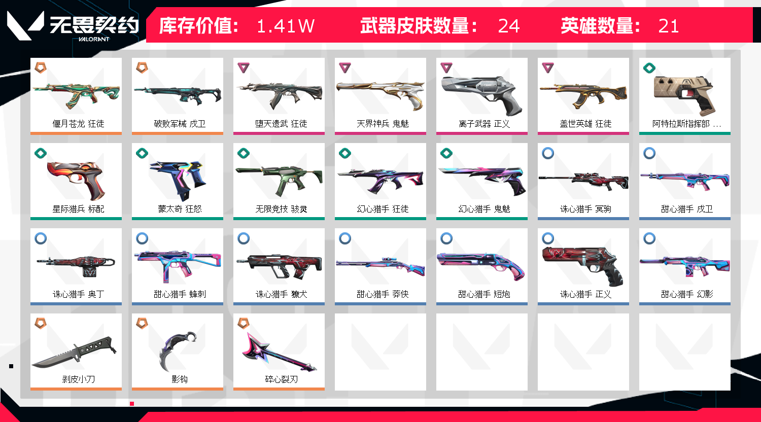 首页 > 租号大厅 > 无畏契约-wegame > wegame/wegame > 允许 英雄18 武器皮肤数量24🚫禁止外挂 炸鱼🚫禁止挂机 有意消极比赛