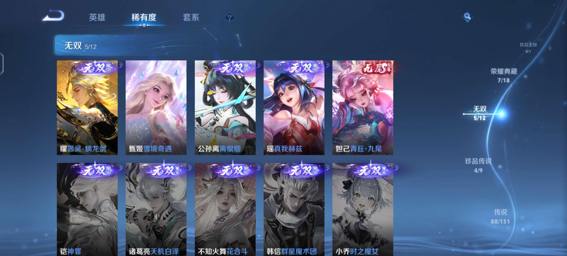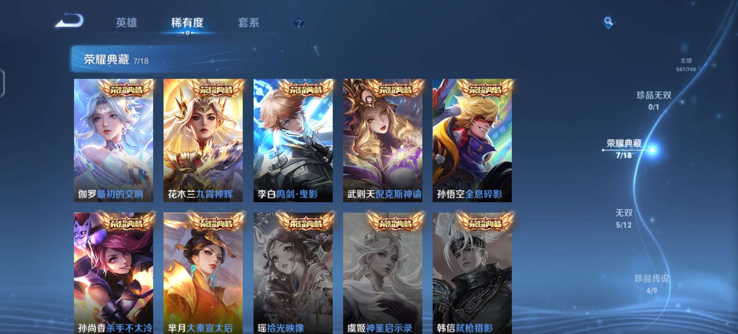 V10、543皮14水、吕布典藏-千魇归渊、愿照·九州拓、愿照·众生和、怪盗基德、伽罗星传说红枫、瑶典藏拾光映像、冥王哈迪斯、、龙年限定、齐天大圣