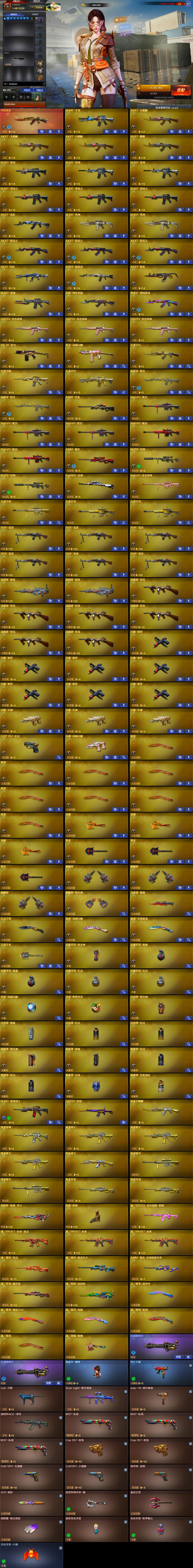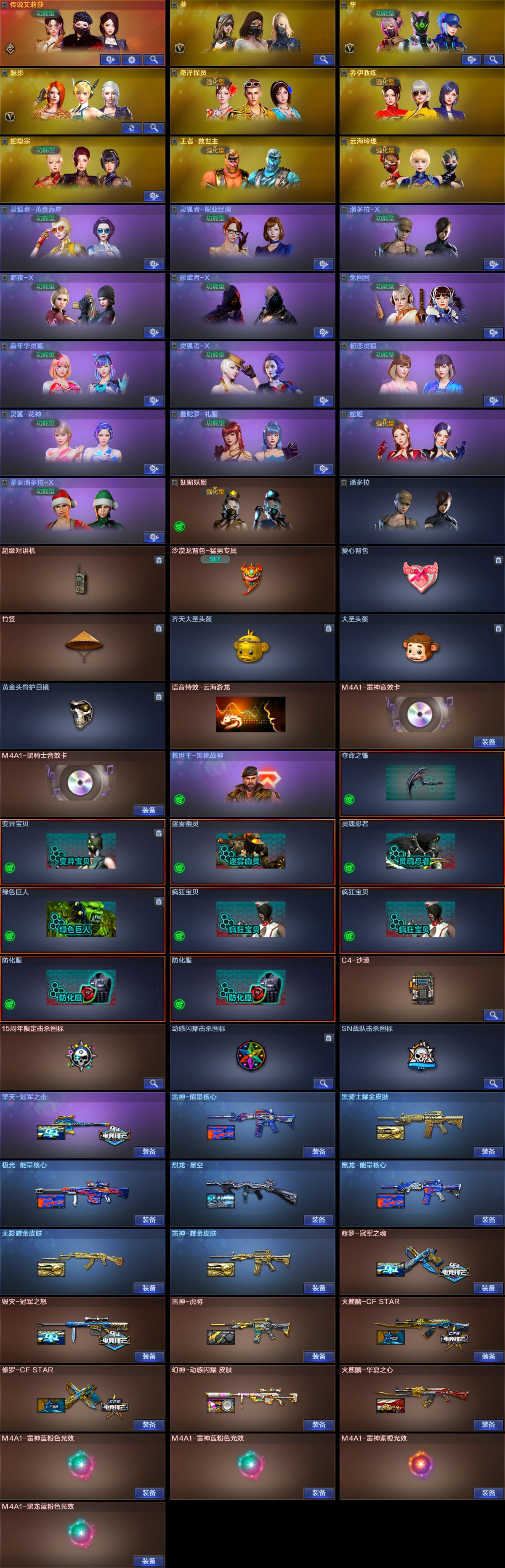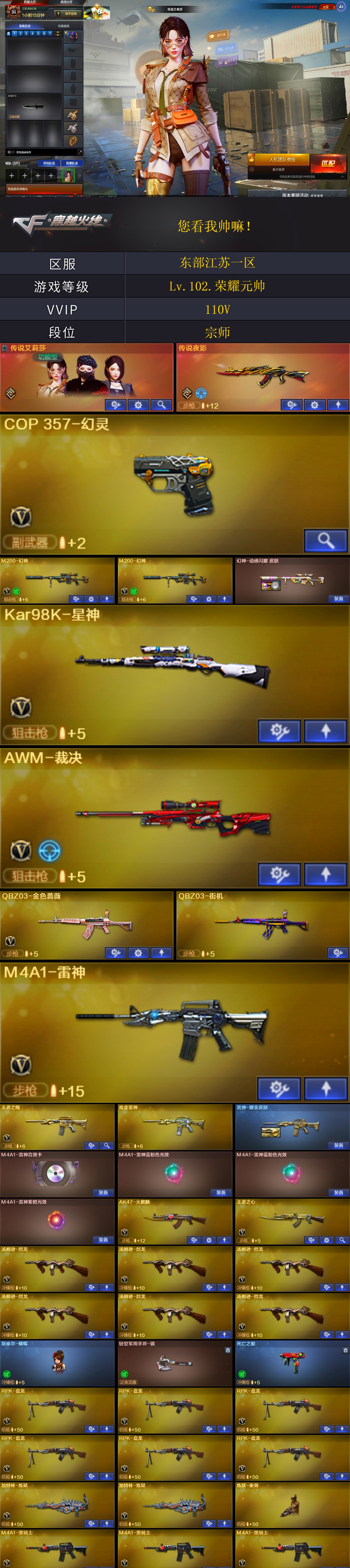 【稀有武器】:传说夜影/M200-幻神(2)/Kar98K-星神/COP357-幻灵/天神-动感闪耀/QBZ03-金色蔷薇(3)/AK47-火麒麟(3)/AK47-麒麟/M4A1-黑龙/M4A1-雷神(2)/M4A1-黑骑士(3)/AK47-无影/AK47-黑武士(3)/Barrett-毁灭(3)/Barrett-极光(2)/AWM-裁决/RPK-盘龙(6)/加特林-炼狱(2)/汤姆逊-烈龙(6)/麒麟刺-堕天神/马来剑-夜魔/幻灵之锋 【王者武器】:王者之心-觉醒版/王者之魄-觉醒版/王者之怒-觉醒版/王者之光(2) 【热门角色】:传说艾莉莎/隼/魅影/奇洋探员/乔伊教练/蛇隐宗/灵狐者-职业经理/潘多拉-X/兔囡囡/潘多拉 【热门音效卡】:M4A1-雷神音效卡/M4A1-黑骑士音效卡 【热门皮肤】:幻神-动感闪耀皮肤/擎天-冠军之击/毁灭-冠军之怒 【其他亮点】:斯泰尔-蝴蝶/炼狱-秦师;隼,传说艾莉莎,RPK-盘龙,QBZ03-金色蔷薇,M200-幻神,Kar98K-星神,
