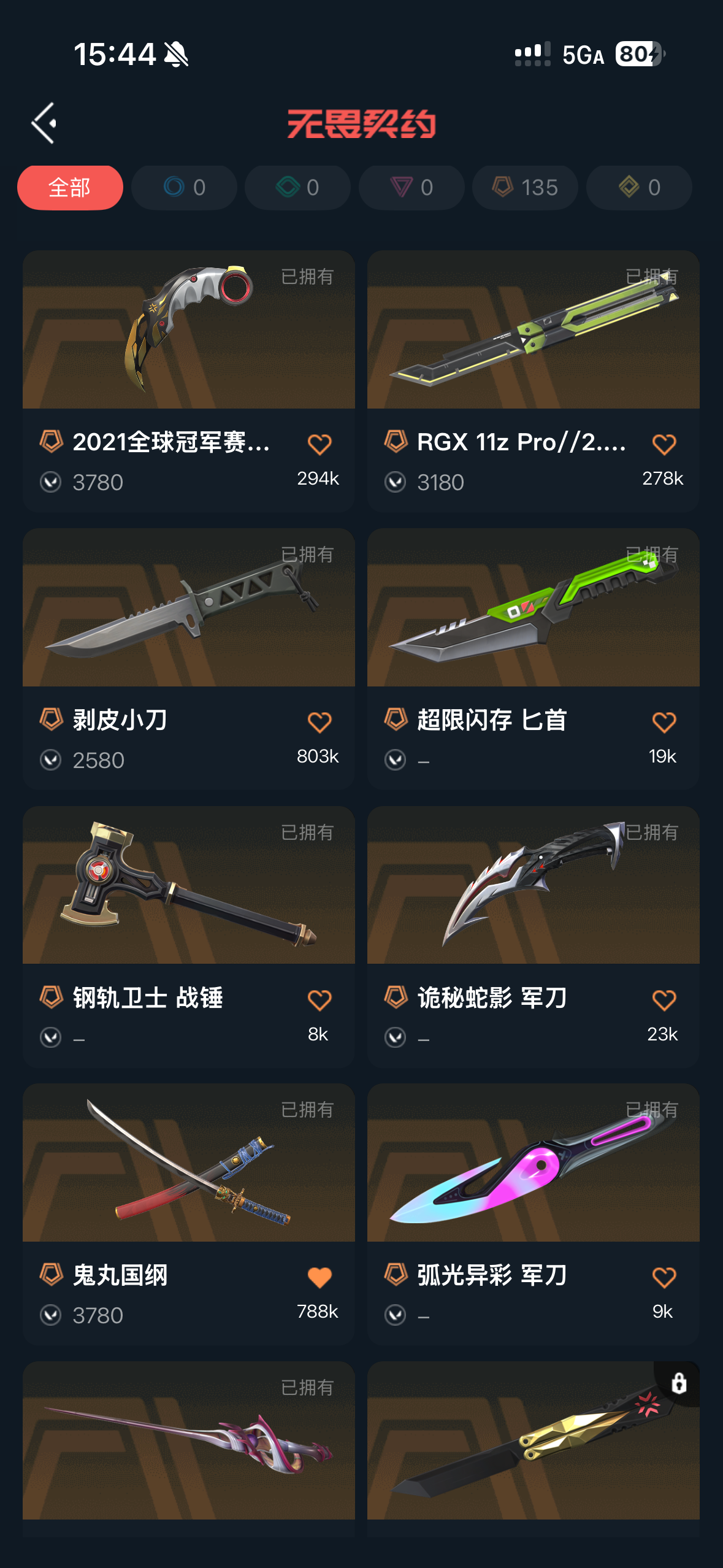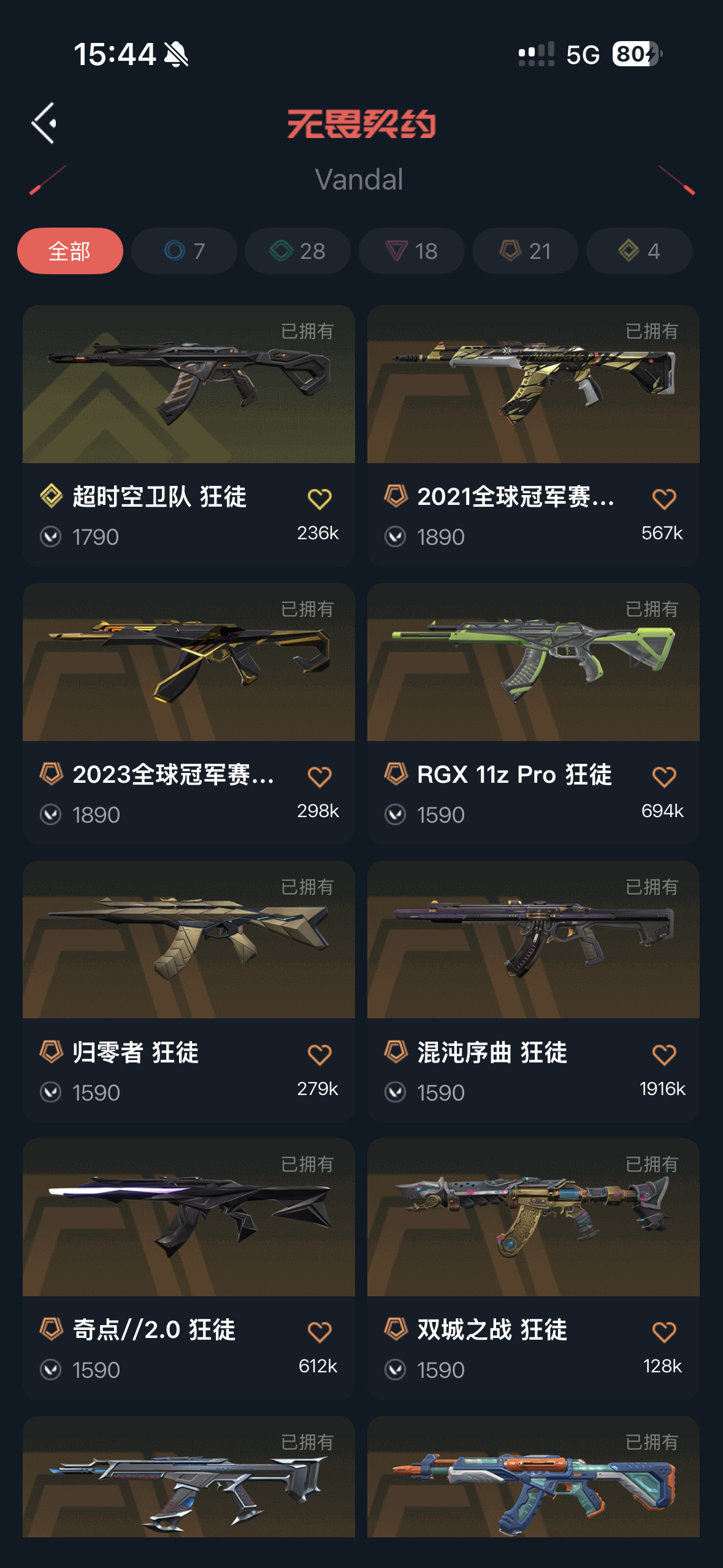狂徒:21冠军,23冠军,显卡,塑水,混沌,超时空卫队,盖亚,归零者,奇点2.0,双城之战,滋滋特工队,般若假面,堕天遗武,掠影,盖世英雄,离子 幻影:砰砰特工队,般若假面 近战武器:21爪刀,显卡蝴蝶刀,剥皮小刀,鬼丸国纲 正义:塑水,边陲 冥驹:堕天遗武 鬼魅:天界神兵 骇灵:通行证 标配:紫金 短炮:通行证 狂怒:鬼丸国纲 蜂刺:通行证 判官:偃月苍龙 雄鹿:奇幻朋克 獠犬:归零者,波谱,鬼丸国纲 戍卫:通行证 飞将:通行证 战神:鬼丸国纲 奥丁:通行证 莽侠:通行证;剥皮小刀,偃月苍龙 判官,归零者 獠犬,盖亚的复仇 狂徒,掠影 狂徒,异鳞魔蛇 幻影,RGX 11z Pro 狂徒,