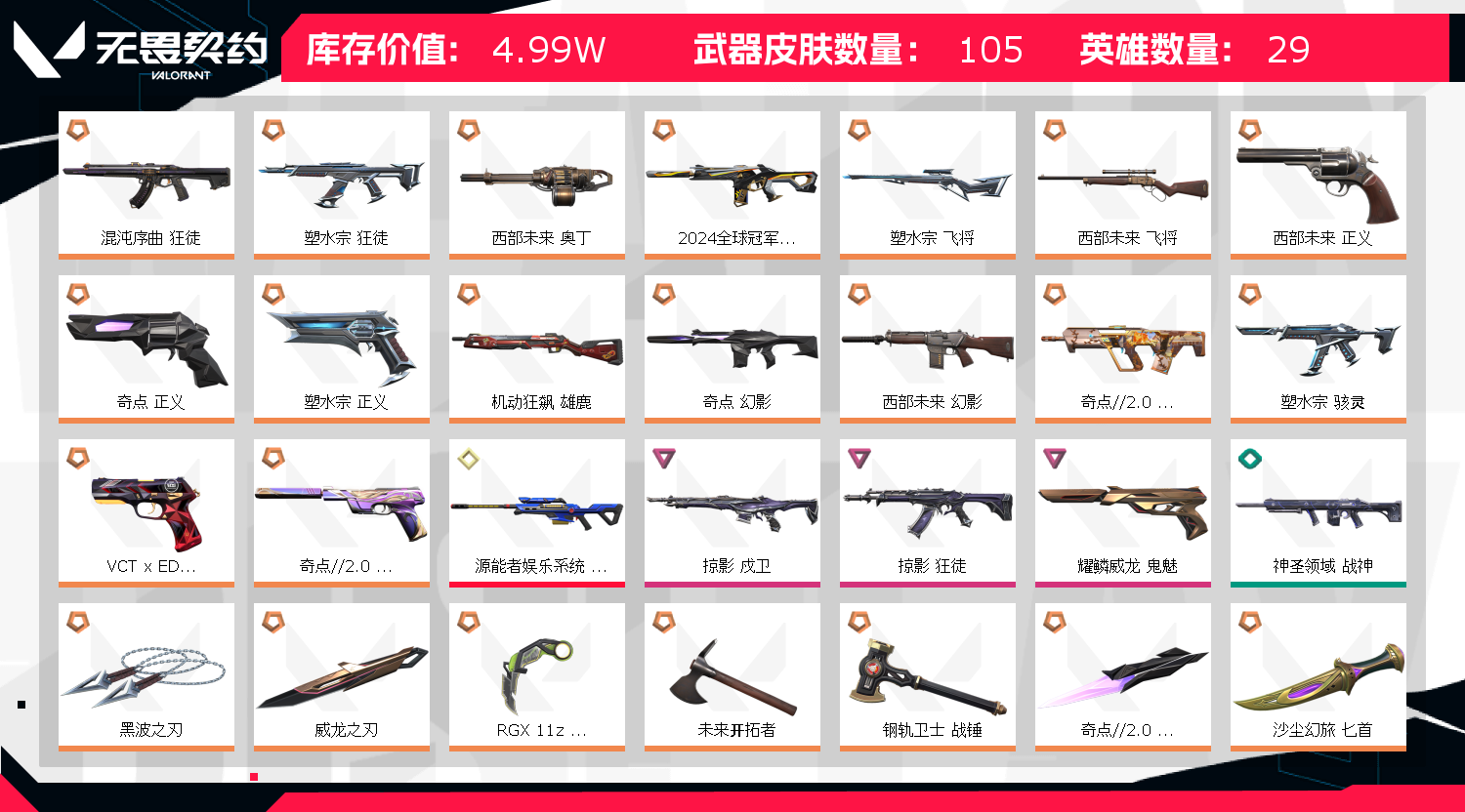 首页 > 租号大厅 > 无畏契约-wegame > wegame/wegame > 5W库/24冠军塑水套西部未来套奇点套显卡爪刀威龙刃混沌狂徒掠影戍卫