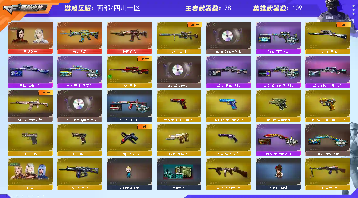 【西.部】氪金天花♥女帝幻神三件套♥星神冠军♥裁决巅峰三件套♥白虎九尾♥qbz三件套♥王者雷霆满副;USP-雷暴,荣耀世冠-柯尔特,传说女帝,RPK-盘龙,QBZ03-金色蔷薇,M200-幻神,Kar98K-星神,