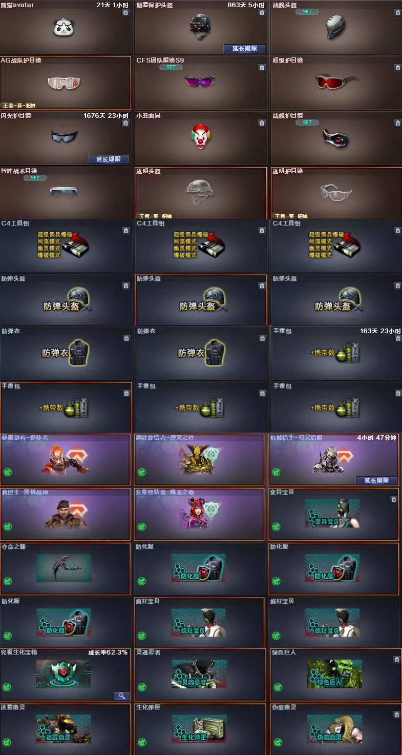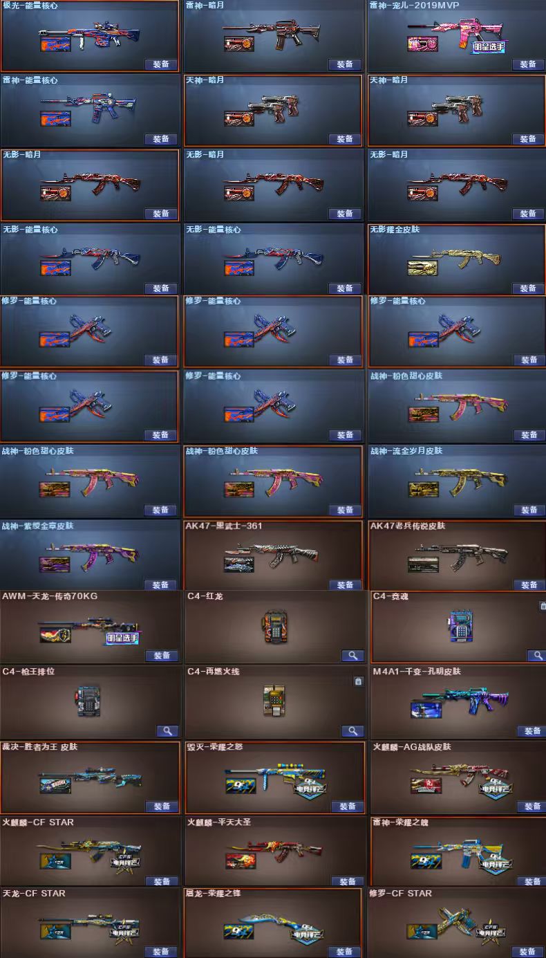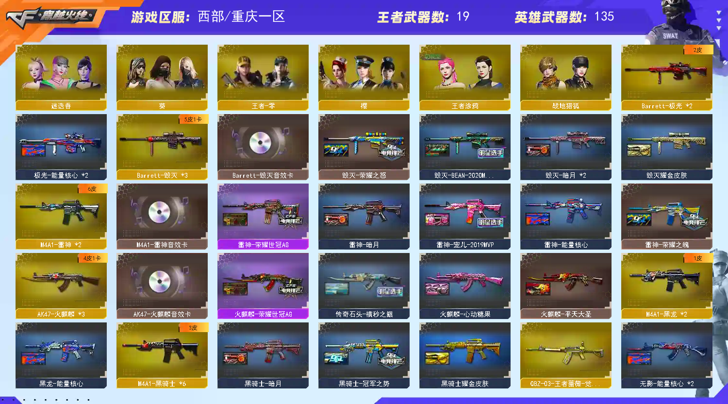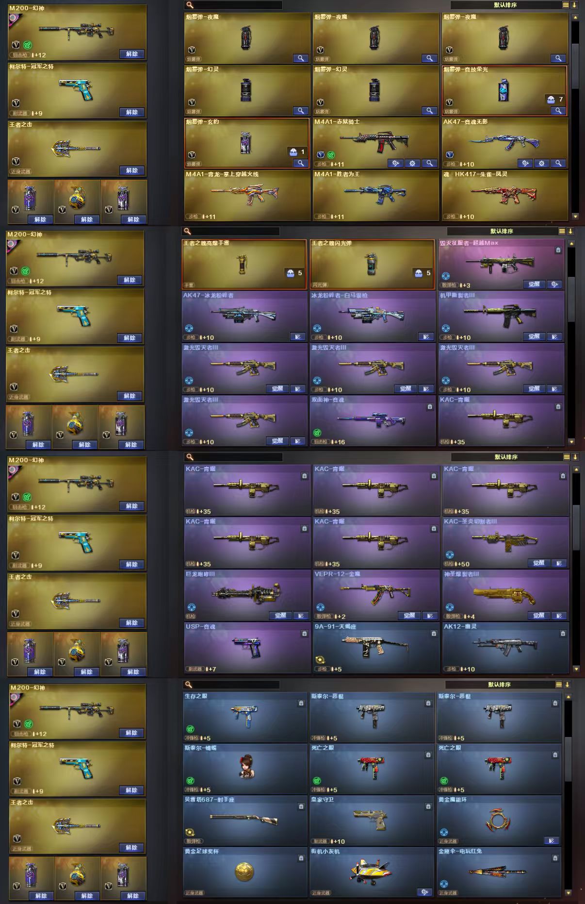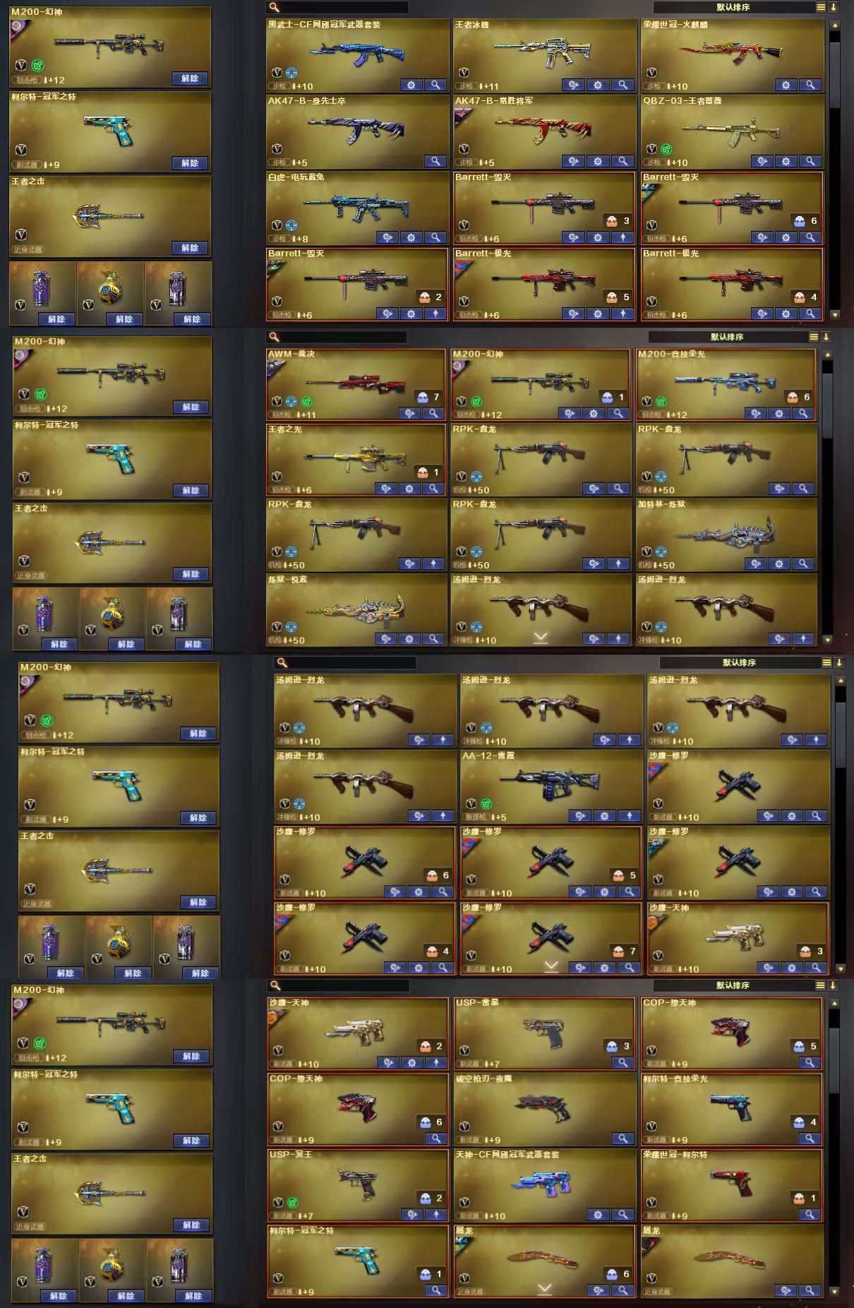 幻神宠儿+幻神音效卡/竞技荣光/裁决胜者为王/极光能量核心/毁灭绿豆++荣耀之怒+冠军SV+毁灭音效卡/qbz冠军之薇/白虎冠军AG+电玩粉兔/王者qbz/黑骑士冠军之势/雷神荣耀之魄+世冠AG+宠儿+雷神音效卡/火麒麟横秒之巅+世冠AG/火麒麟音效卡/白虎蓝兔/王者之势/6烈+蝴蝶/4盘+炼狱/USP冥王/COP堕天神*2/USP雷暴/冠军之特/世冠柯尔特/荣光柯尔特/破空枪刃夜魔/角色:4防云悠悠/4放王者葵貂蝉/4防王者涂鸦/VIP6;USP-雷暴,荣耀世冠-柯尔特,柯尔特-冠军之特,电竞教官-云悠悠,RPK-盘龙,QBZ03-金色蔷薇,M200-幻神,