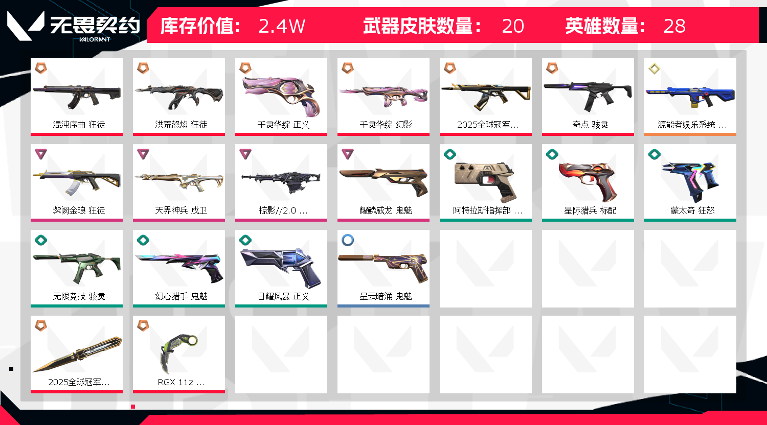 首页 > 租号大厅 > 无畏契约-wegame > wegame/wegame > 可排位*25套*混沌狂徒*紫金狂徒*莲花正义*流脓狂徒*莲花幻影*掠影奥丁*显卡爪刀